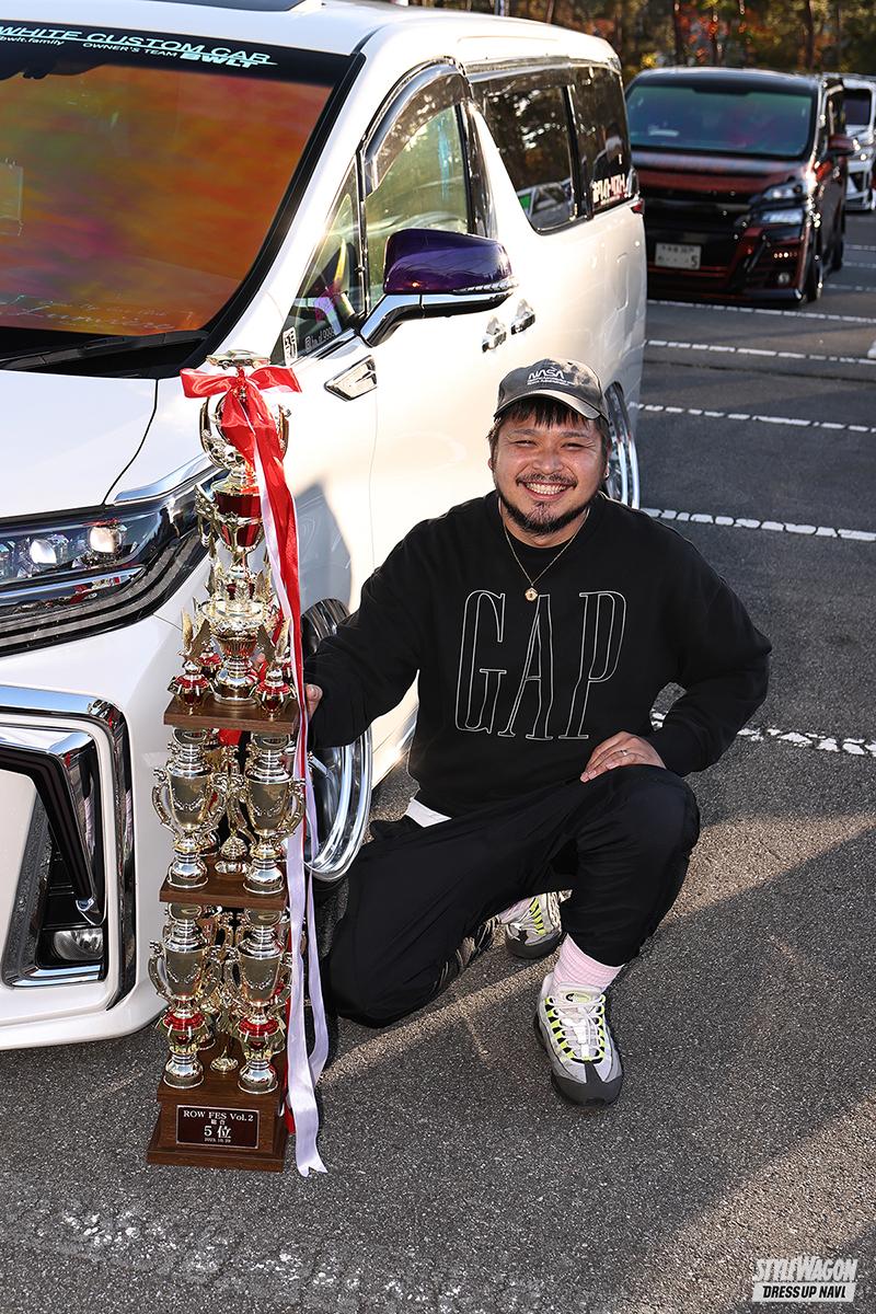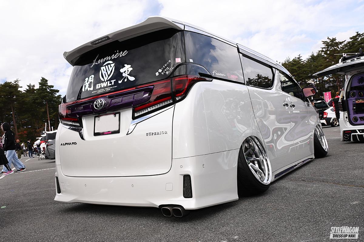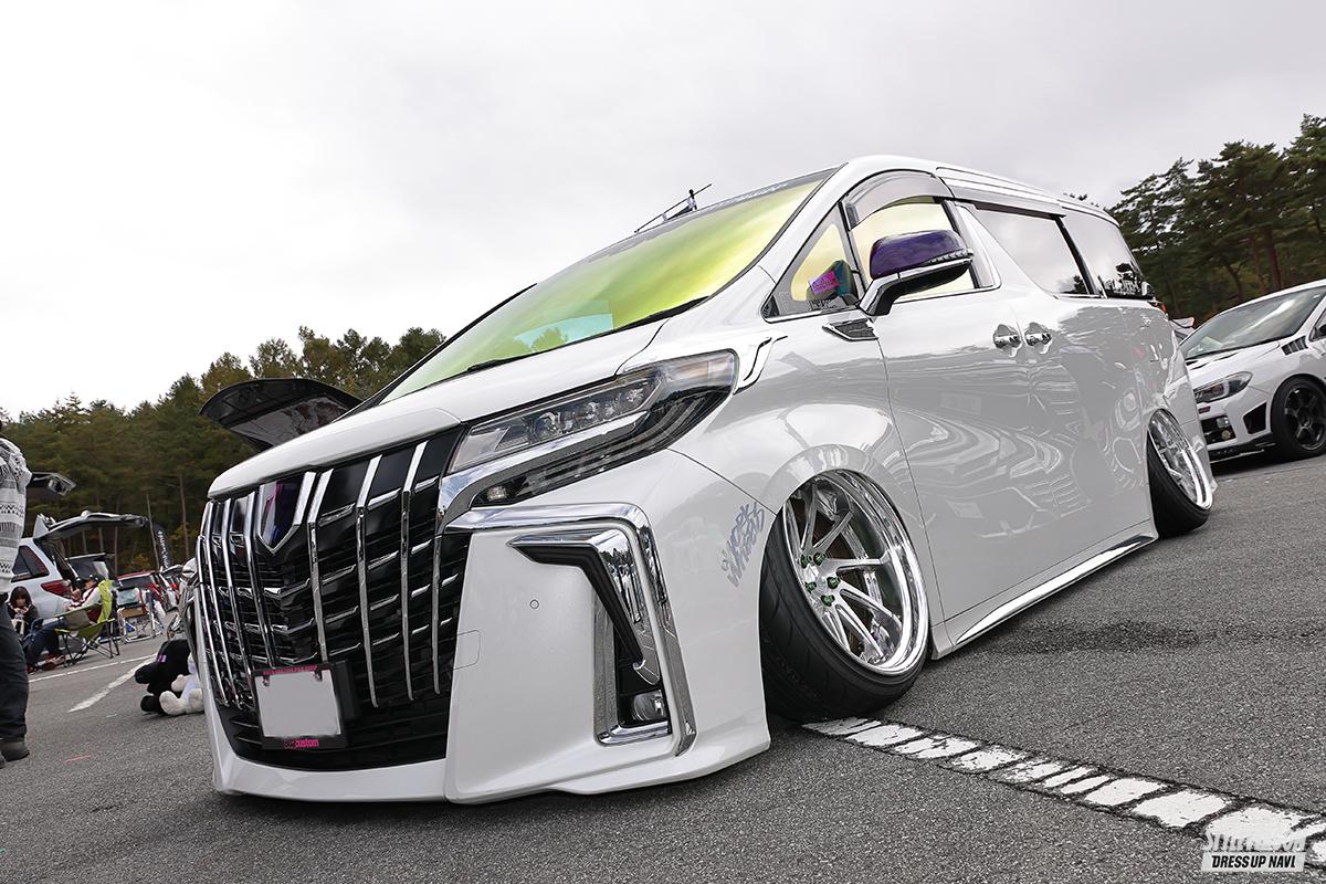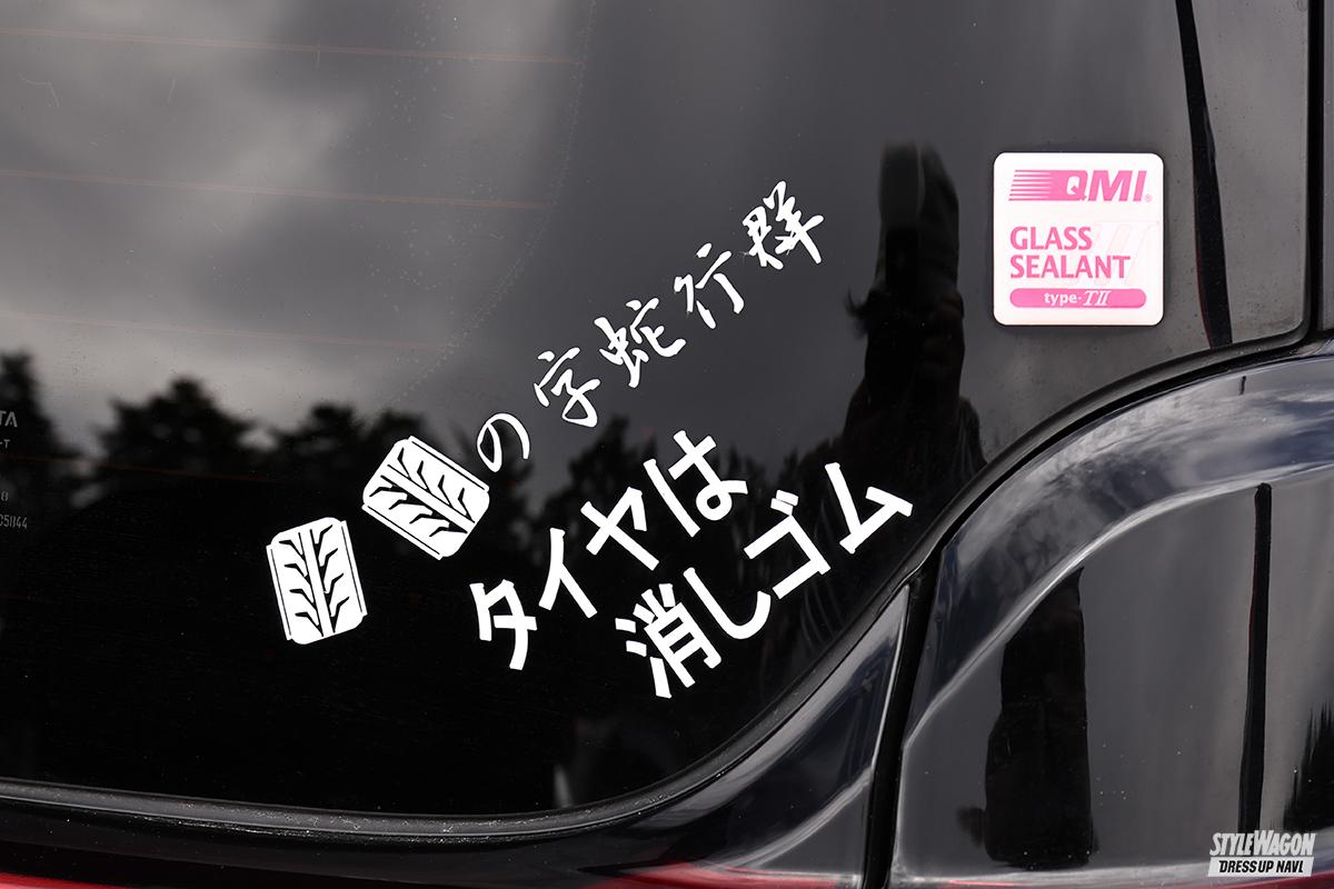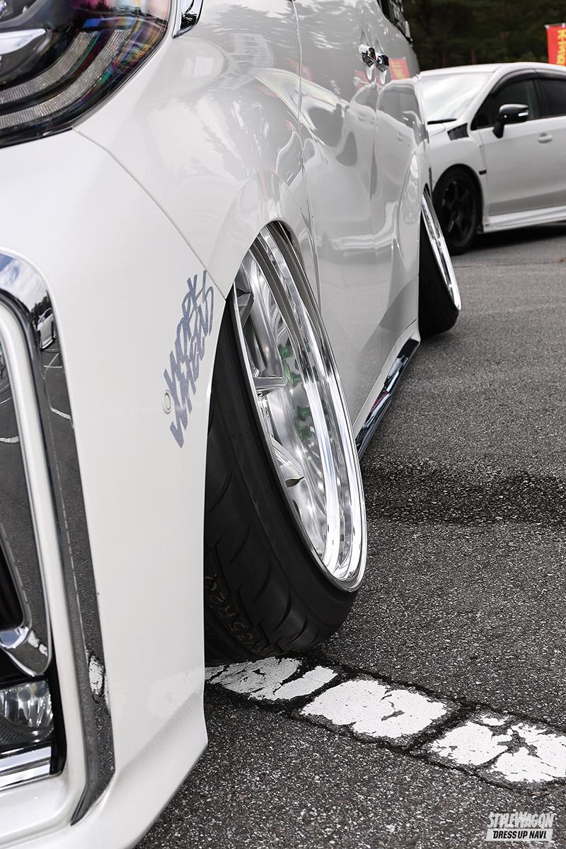 キャンバー角だけでも会場内で目立っていたケンアルさんの愛車。とにかく前後のキャンバー角がハンパない(15度)のだ! 「えぐいホイールを入れたくて。このキャンバーはその結果」なのだそうで、ホイールのスペックを訊くと20インチでリム幅10.5、インセットは前-20・後-30と驚異的な数字が並ぶ。「倒せば10.5も入るんです」とはオーナーの言。しかしその代償はある。リアガラスに貼ったステッカーの通り『タイヤは消しゴム』なのだ。大きなエアロに頼らず、足まわりのセットアップでこのカタチ。ドレコンで総合5位に選ばれるのは伊達ではない!!