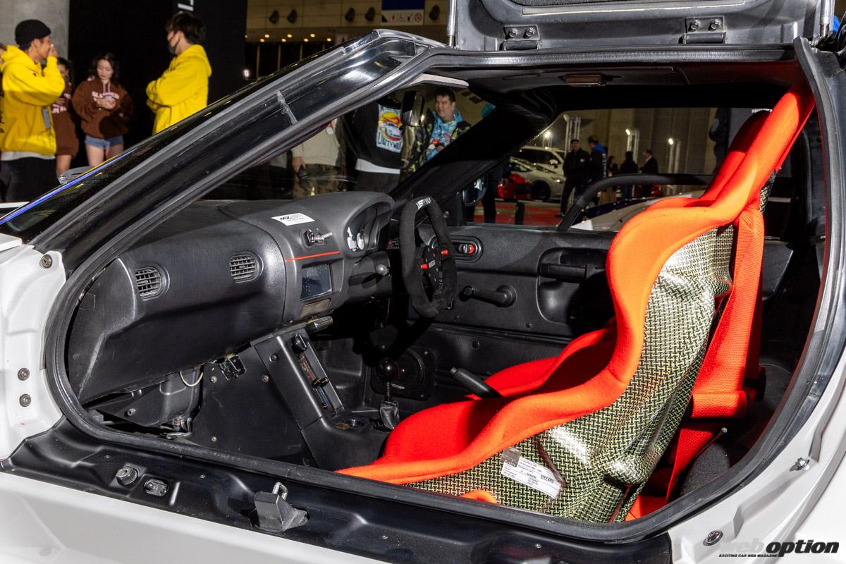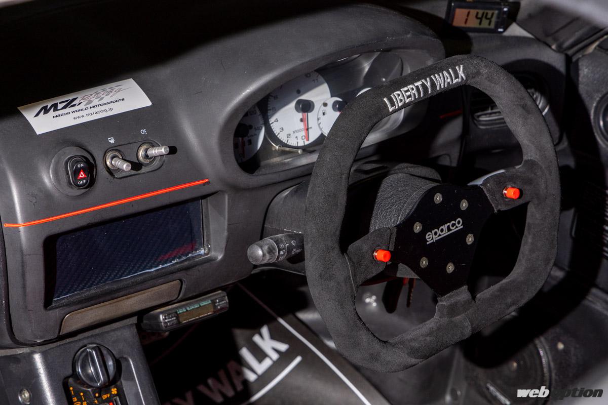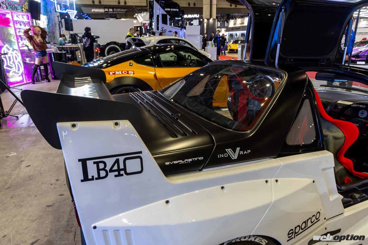 「LB-WORKS LB40」と銘打たれたAZ-1。ボディキットは軽自動車の規格(枠)に収めるための辻褄合わせなどせず、スタイリングを最優先。そのため、完全に白ナンバー(普通車枠)の寸法だったりするが、この圧倒的な存在感は唯一無二だ。