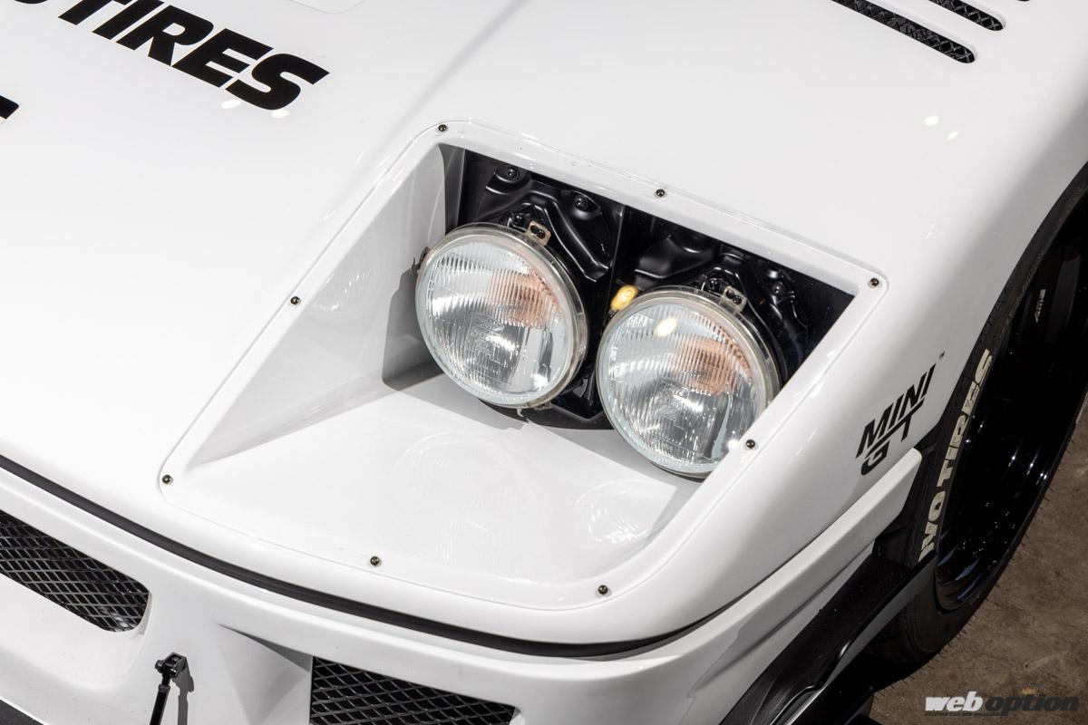 フロントセクションはカウル一体型のフードに加え、LMフェイスを再現。ヘッドライトはF40と同様のものをインストール。元々、AZ-1は幅が狭く背が高いフォルムのため、アンダーカナードを追加して前後のバランスを整えながらワイド&ローのスタイリングを生み出している。