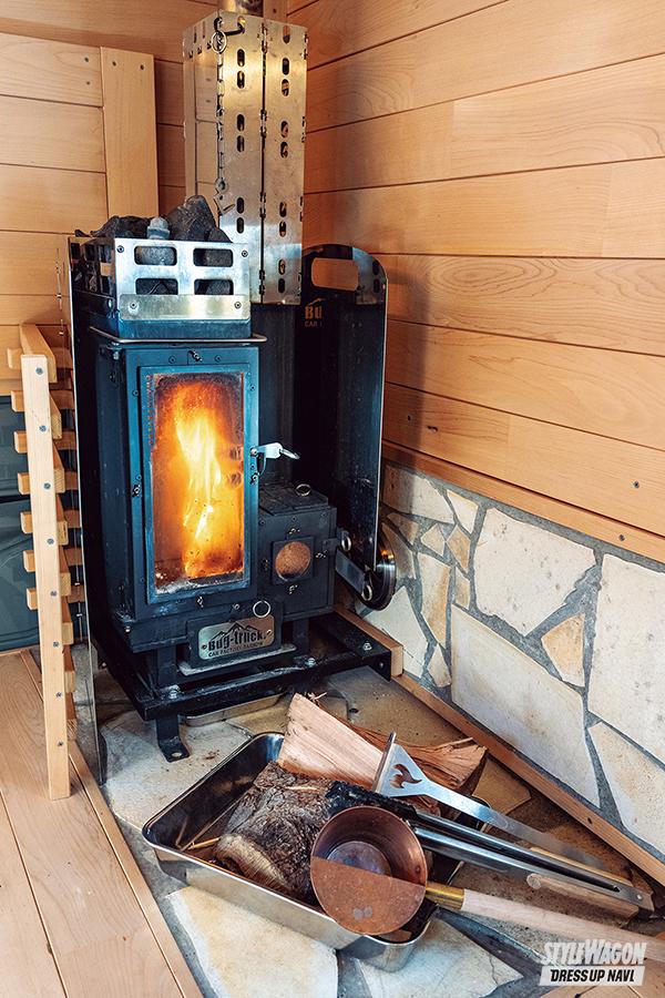 このサウナ無番地はもちろん、標準のパネルバンにもオプションで薪ストーブの設置が可能。厳しい寒さの中でも車内は暖かく、炎のゆらめきを眺めながらのんびり過ごせるというわけ。
