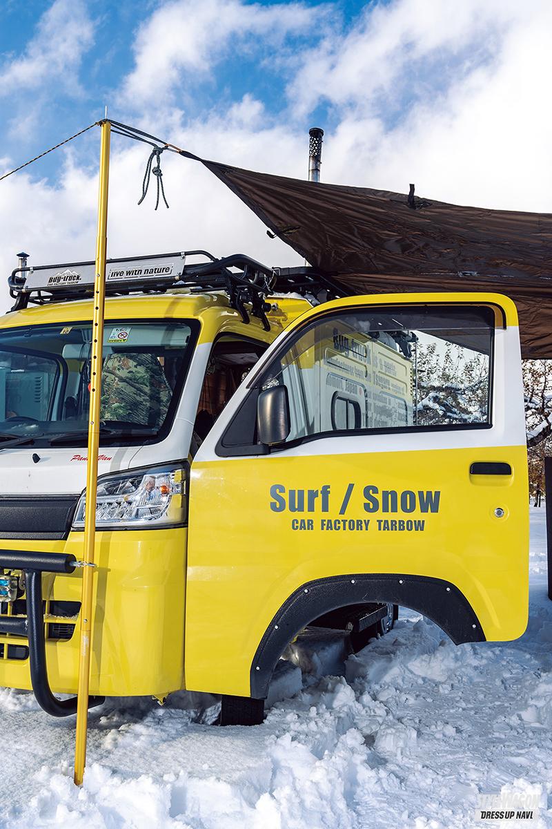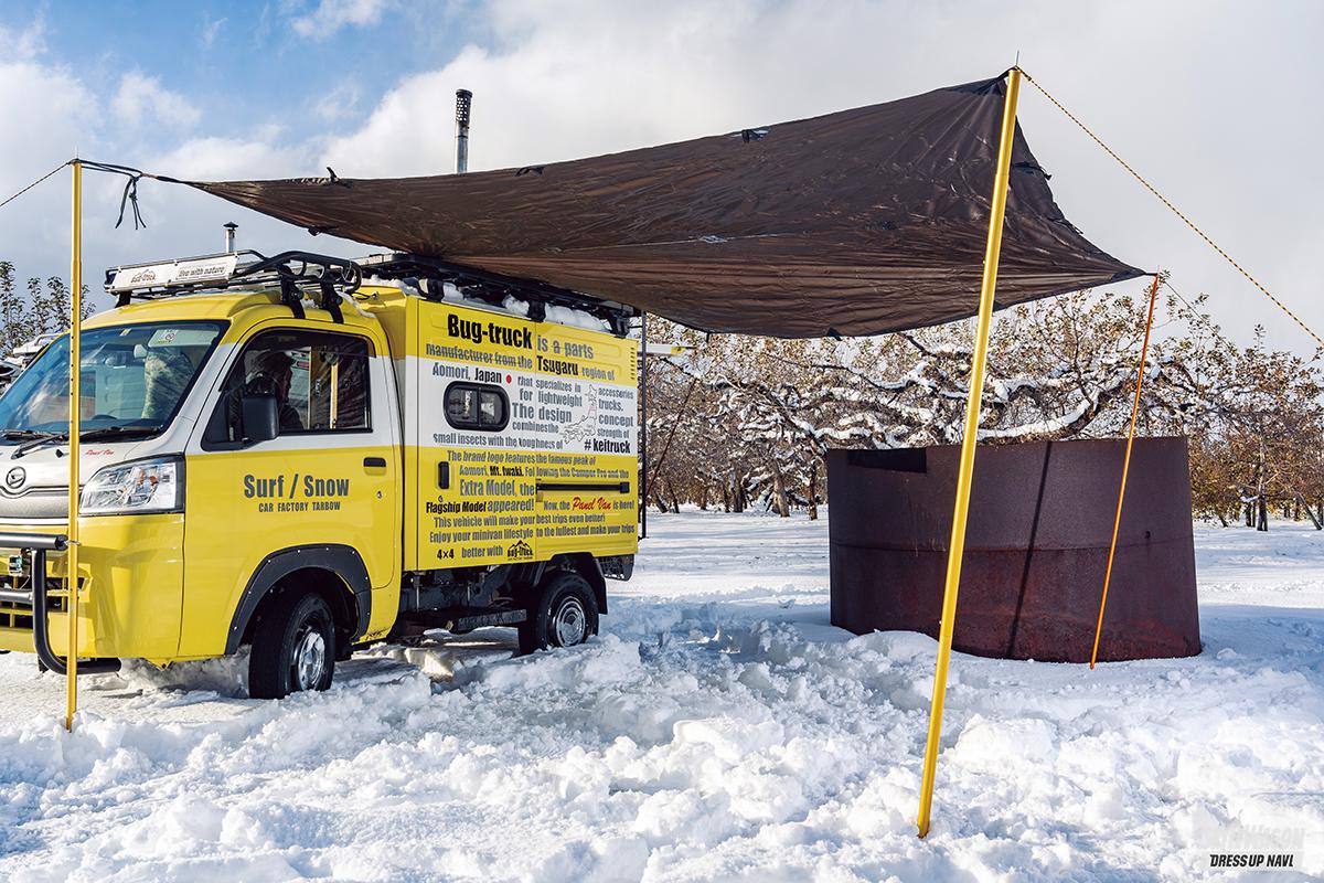 高い積載性と耐久性を備え、農道も苦にせず走れる軽トラは、もともとアウトドアユースとも相性がいい。そこに多機能な荷台テントキットを組み合わせ、可愛らしくもお洒落に仕上げたのが、ご存知「バグトラック」。開発したのは青森県のカーファクトリーターボーで、車中泊ならぬ「荷台泊」という文化を軽トラオーナーたちに広めた。