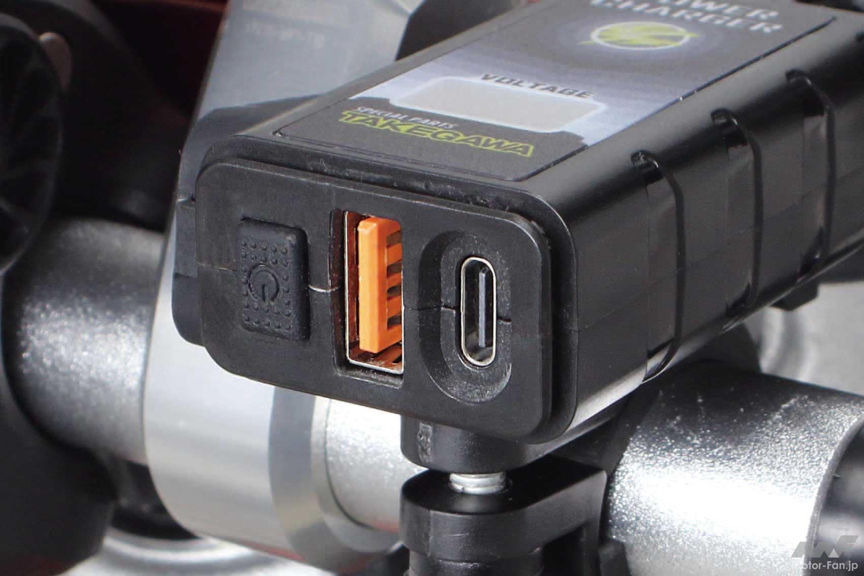後付けタイプのUSB電源は安価なものから多機能なものまで数多く販売されているが、急速充電機能が備わっているものはまだまだ少ない。スペシャルパーツ武川(以降、SP武川)から発売された「USBチャージャー(2ポートTYPE-A/C)」は、急速充電に対応した2つのポートを備え、USBタイプAポート側はQC3.0に対応した出力電圧5V、/3.4A、9V/2.5A、12V/2A、USBタイプC側はPDに対応した出力電圧5V/3A、9V/2.22A、12V/1.67Aとなっている。本体には電圧計を装備しているので、車体側の電圧をリアルタイムで表示してくれる。バッテリーの電圧管理が行えるので、バッテリーの状況を把握してトラブルに備えることができる。また、充電器本体にON/OFFスイッチを備え、不使用時には電源をオフにしておくことで、バッテリーの無駄な消費を抑え、スマホやタブレットの保護も可能。出力が大きいのでアクションカメラやノートパソコンの電源としても活躍できそう。