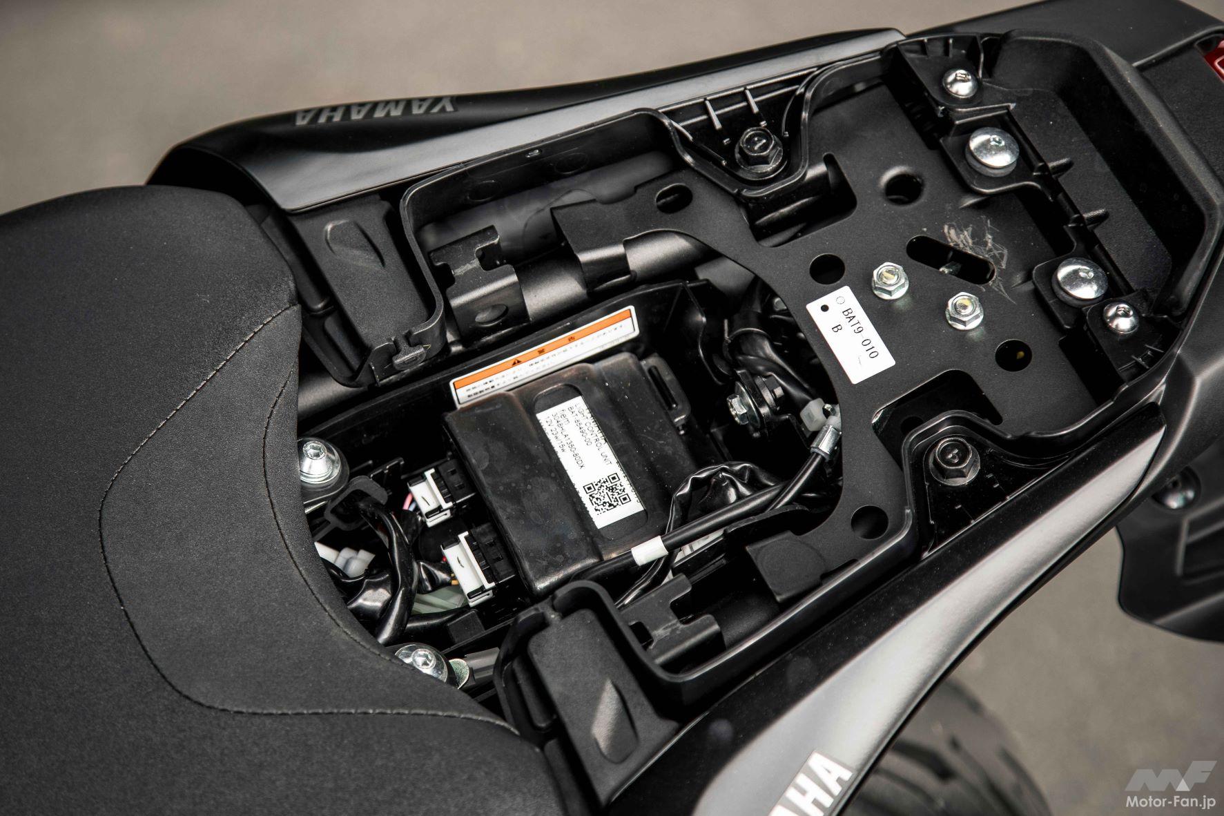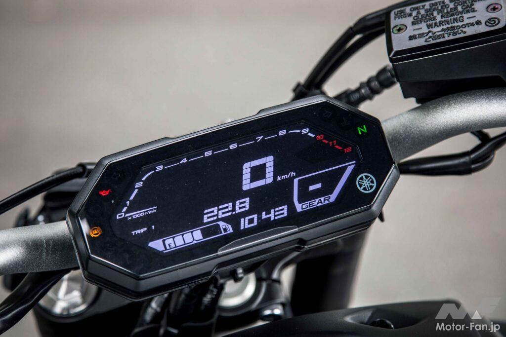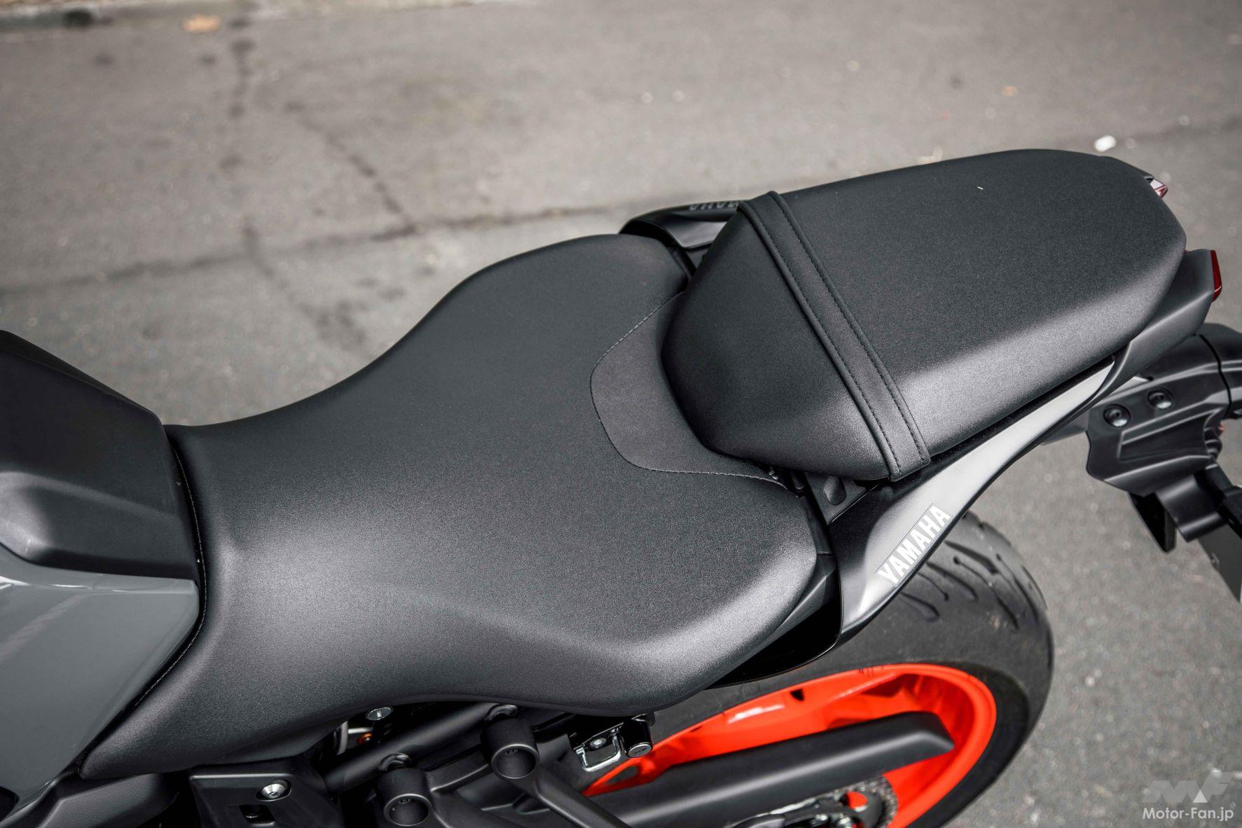 一昔前には大型バイクに分類されていたMT-07ですが、スリムでコンパクトなボディは184㎏という車重に抑えられています。400㏄クラスのロードスポーツ並みです。2度目となるマイナーチェンジで精悍なスタイリングとなりましたが、大きさで威圧しない点は従来と変わりありません。気を良くして跨ってみると、足つき性が抜群に良いわけではないものの、車体がスリムなので不安を抱くことはありません。タンクカバーの変更やハンドルポジションを32㎜ワイドに、12㎜高くしたことでポジションはよりアップライトになり、従来にも増して親しみやすくなった印象を受けます。これなら低速での取り回しもしやすいし、ツーリングでの疲労も軽減されているはずです。