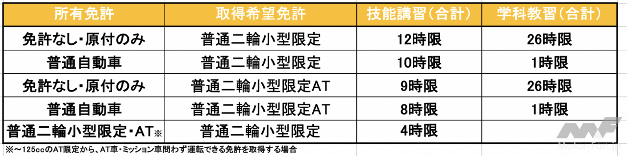 2018年5月31日に道交法規則が見直され、「AT小型限定普通二輪免許」の取得期間が、最短3日から2日に短縮された。具体的には、1日に受けられる技能講習が3時間までだったのが、4時間までに変更されたことで、計8時間必要な技能講習が2日で修了できることになった(普通自動車免許保持者の場合)。