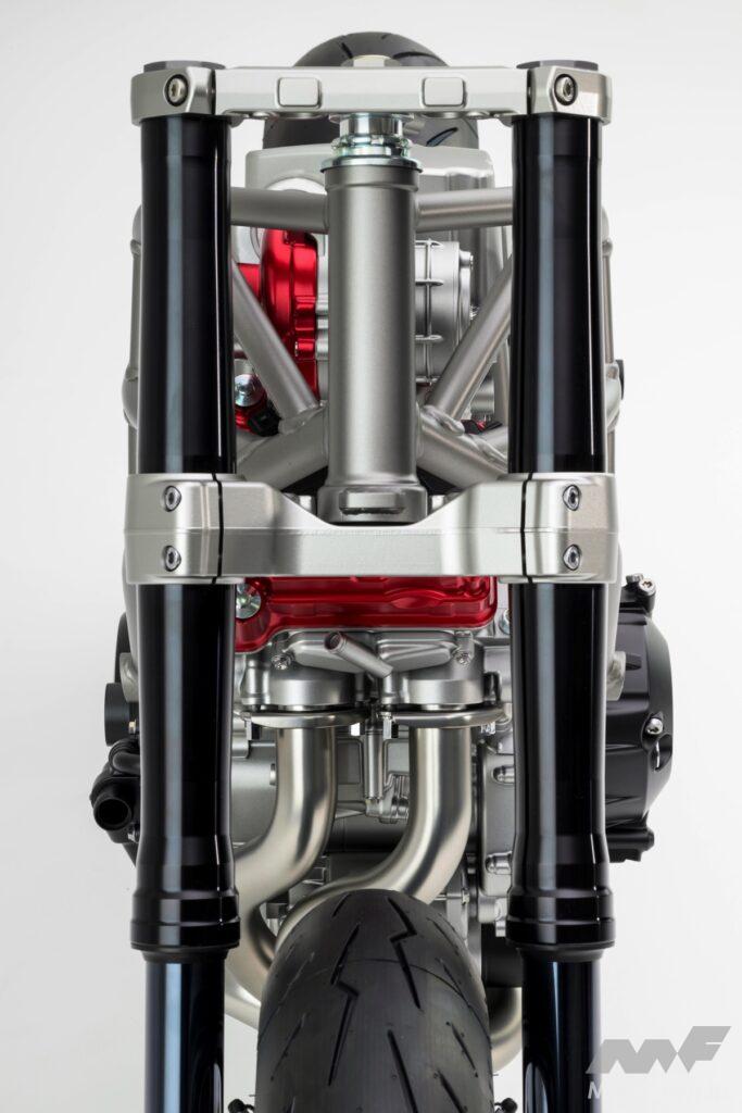 なぜこのような一般的ではない形状を採用したのか、それはひとえにライダーの乗りやすさの追求であろう。パワーを求めるなら直列4気筒が無視できないが、それではバイクの横幅が広くなる。