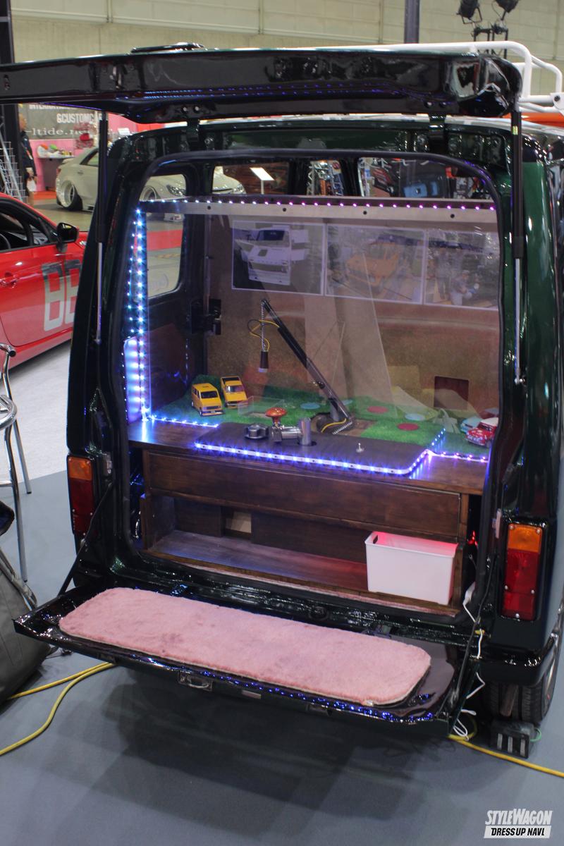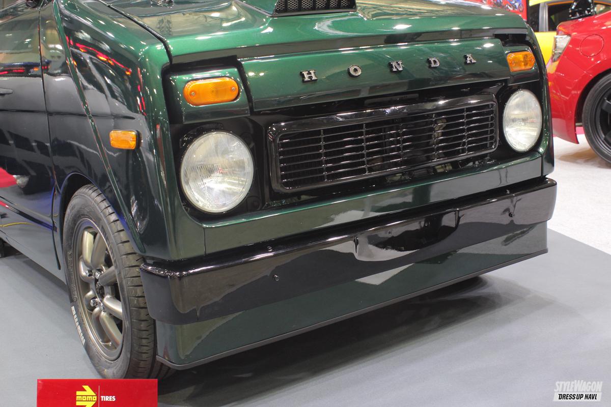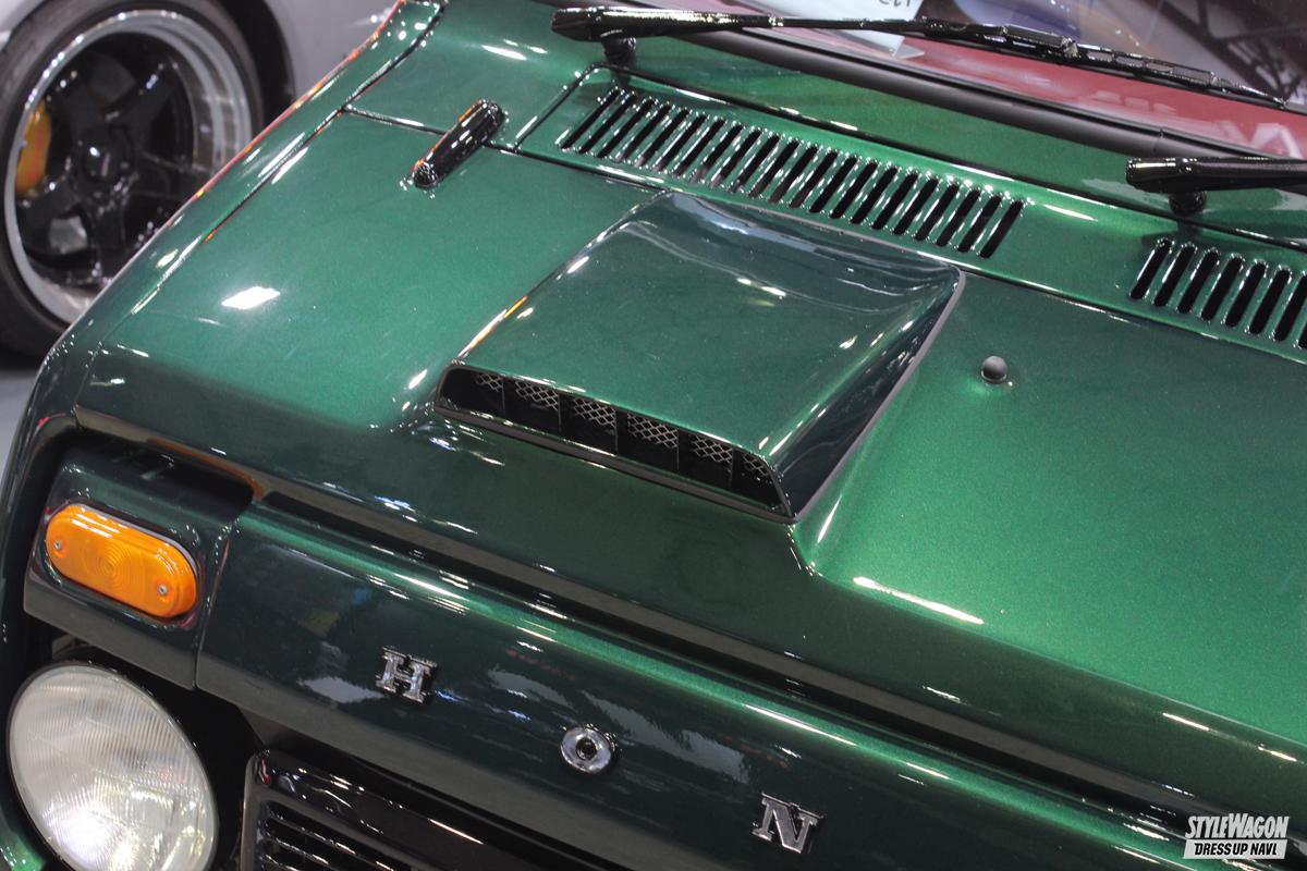 テーマは「アソビココロ」。旧車好きの大人から子供まで、幅広い人たちが楽しんでもらえるようなクルマ作り。大人達がイメージするライフステップバンといえば、パステル系のカラーだが、英国の高級車のような雰囲気を作り出すため、ボディカラーはブリティッシュグリーンを選択。ロールスロイスやベントレーのような空気感を作り出している。基本的には車両の純正フォルムを崩さないようカスタムされているが、フロントバンパーは下方向へ延長、ボンネットのダクトは後付け感がないように成形されている。そして完全オリジナルのルーフラックは、ホームセンターで購入したという鉄パイプで制作。爽やかなホワイトカラーはこだわりのチョイスで、シビックタイプR純正のチャンピオンホワイトで塗装されている。