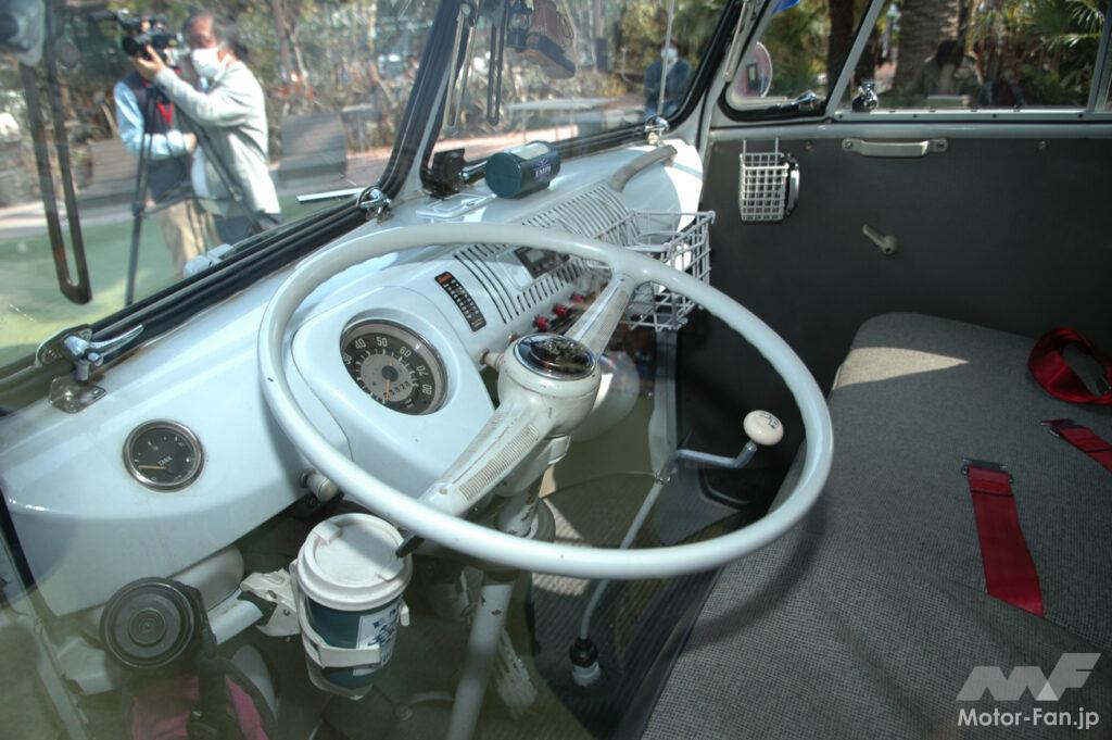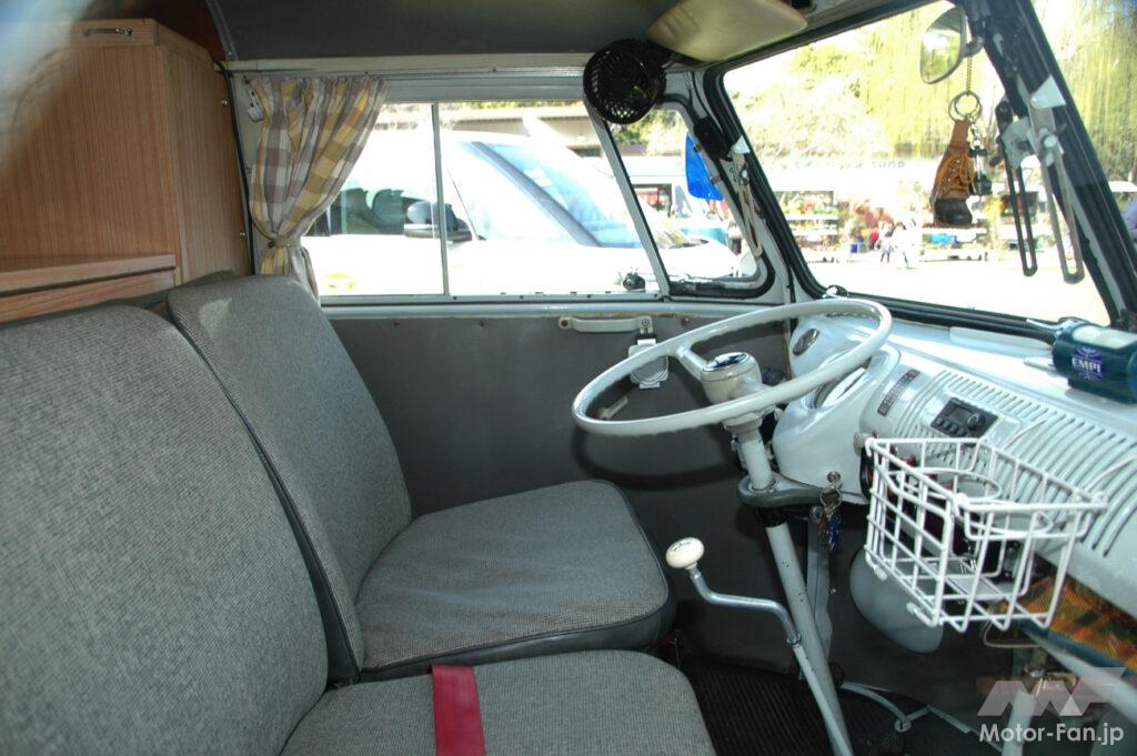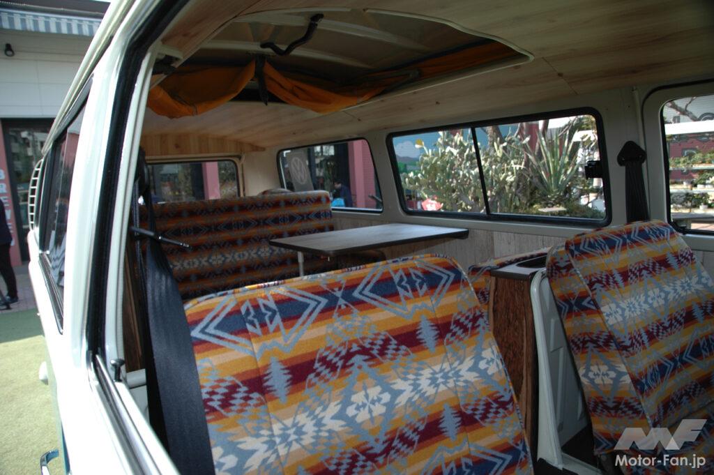 展示されたT1の来歴までは紹介されていなかったが、ポップアップルーフの前後にキャリアを装着。後席には棚などを設たキャンピングカー仕様になっていた。加えて、リヤバンパーにはヒッチメンバーも設置されていた。