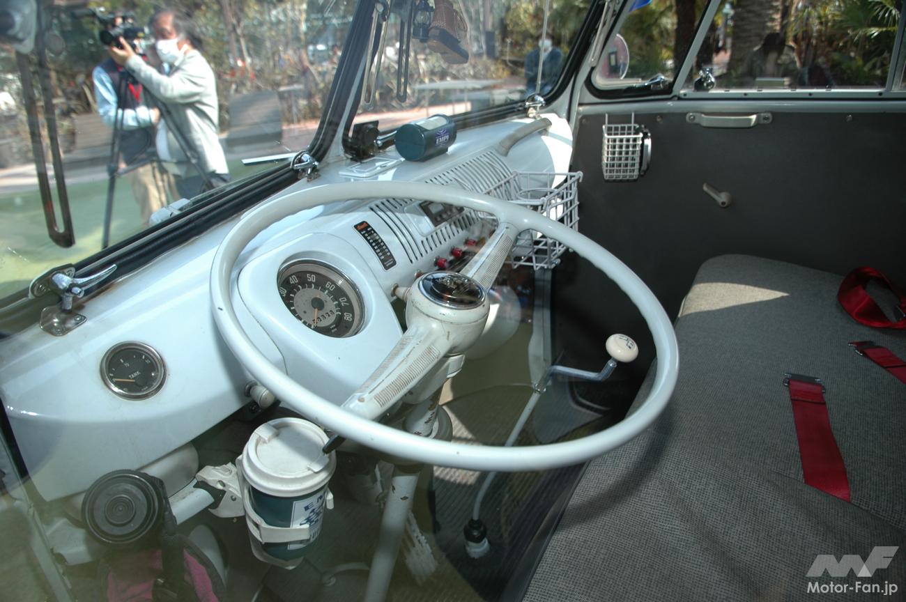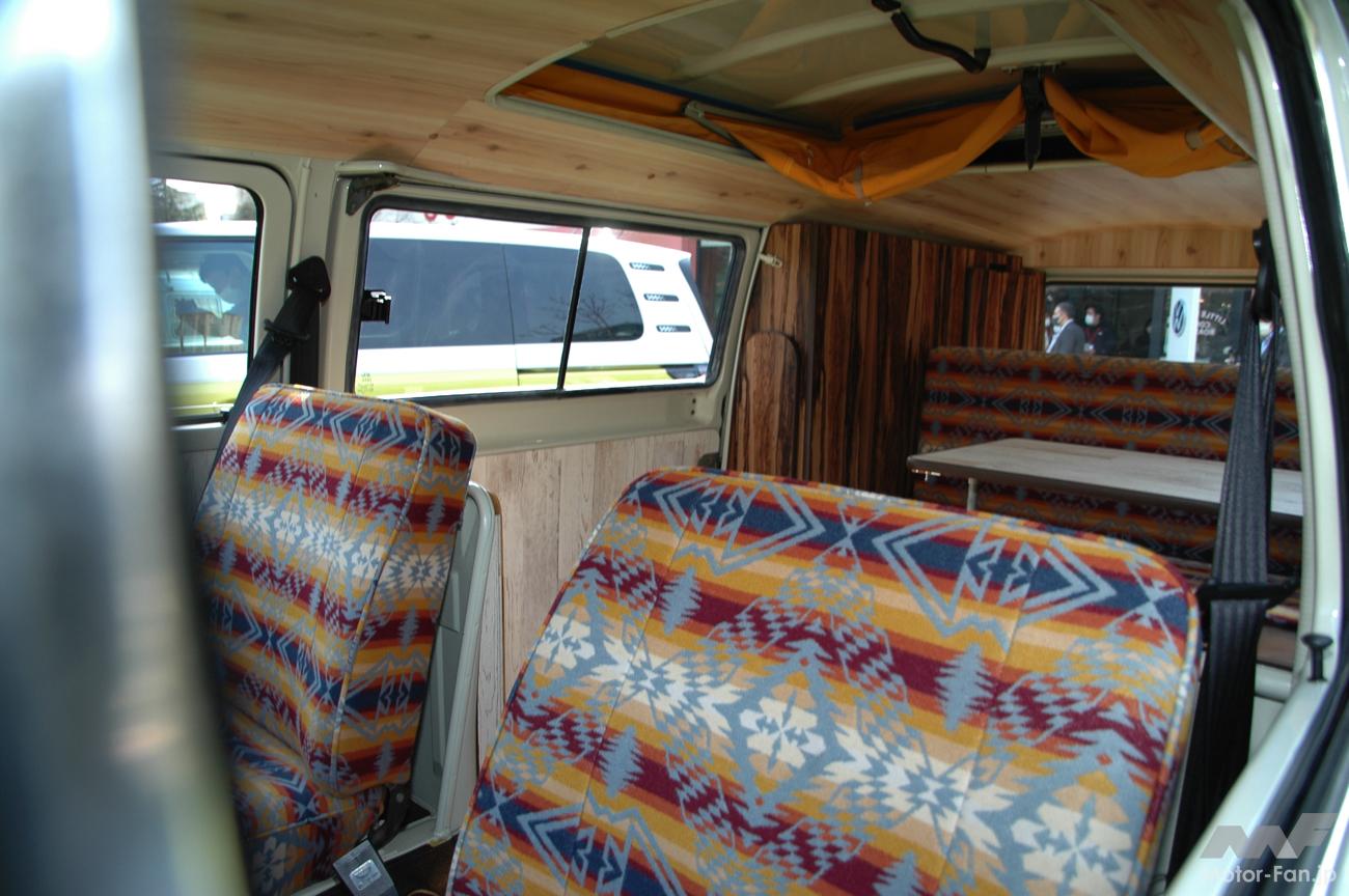 展示されたT1の来歴までは紹介されていなかったが、ポップアップルーフの前後にキャリアを装着。後席には棚などを設たキャンピングカー仕様になっていた。加えて、リヤバンパーにはヒッチメンバーも設置されていた。