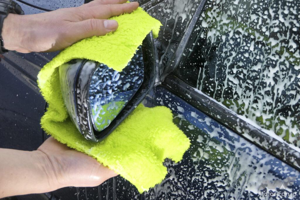 ドアミラーなどの出っ張った部分を包み込むように洗えるほか、グリルの隙間などには差し込んで洗えるのはクロスの大きなメリットだ。またこのフリース生地は細かい汚れもしっかりキャッチするいっぽうで、すすげば付着した汚れを簡単にリリースするため、洗車には最適。これまでにない使い勝手と感触が得られる洗車用アイテムだ。