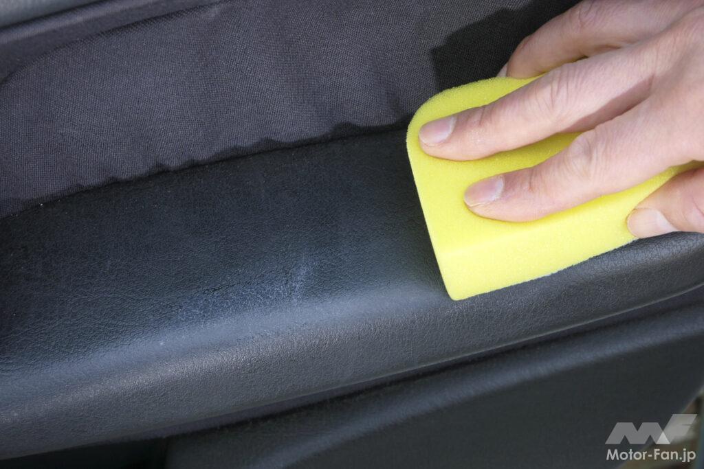 シボエグゼブラシは、ポリエステルのブラシ部が、高密度で編み込んだ約0.045mmの超極細毛で形成されており、それがシボ奥の汚れをしっかりかき出してくれる。本体はスポンジでできているので、適度に変形してくれて、凹凸のある部位にもフィットするので清掃しやすい。そのおかげで、ドアハンドル部分やドリンクホルダーなども簡単に掃除できる。