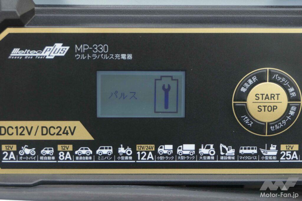 また、MP-330が持つもうひとつの特徴がセルスタート始動モードを搭載すること。100V電源からバッテリーへ充電すると同様に、セルスターターに必要な電力をまかなうことができるのだ。急なバッテリー上がりにも対応できる優れモノなのだ。