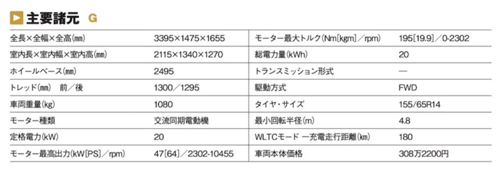 一充電走行距離は180㎞(WLTCモード)と短め。ヒーターを使う冬場などは100㎞強程度と考えておいた方がいいだろう。高速道路を使ったロングドライブには向かないのだが、日常の買い物や通勤をメインとするのなら問題ないだろう。街中や郊外路の平均速度はおおむね20〜30㎞/hなので、少なくとも3〜5時間は走れるので十分だ。それでいて自宅充電できればガソリンスタンドに行く手間がなくなる。特に地方では向いているだろう。