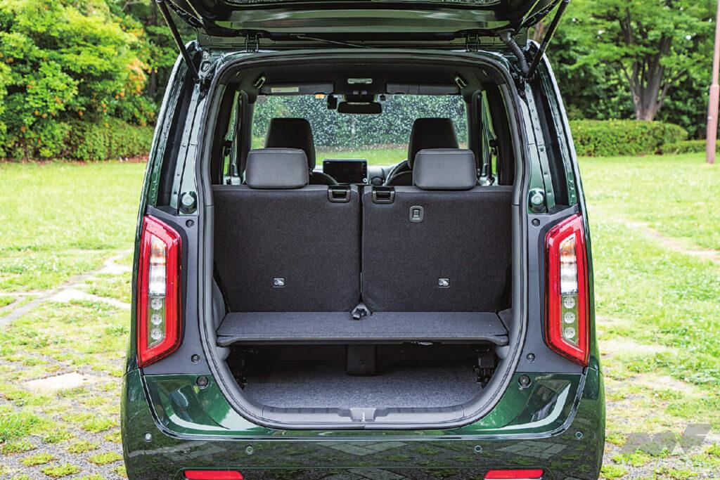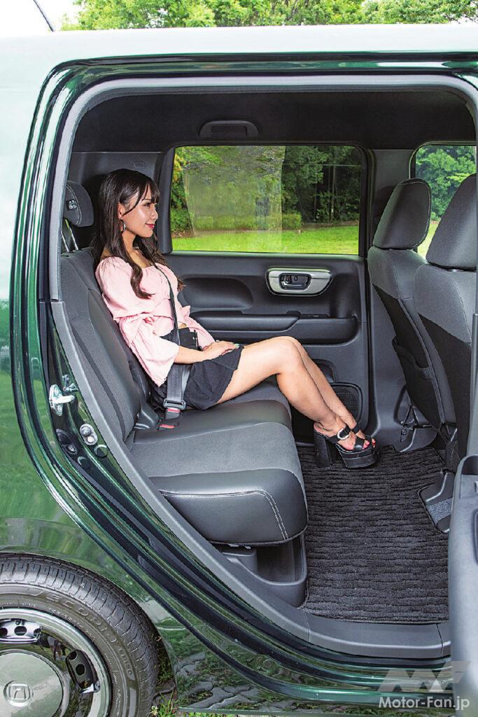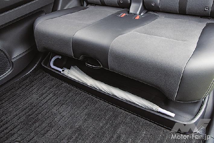 プラットフォームはNシリーズ共通で、ガソリンタンクを前席の下に配置した〝センタータンクレイアウト〞を採用。室内の使い勝手は、N-BOXとは違いをもたせている。後席は前後に200㎜スライドでき、最後端にすれば大人でも足を組めるほどのスペースがあるが、クッションは左右一体式。折り畳みも背もたれが前に倒れるだけと、座面が連動して沈むN-BOXに対して簡素化されているが、その分クッションが分厚く、座り心地が良い。多用途性より、後席に大人が乗っても快適に移動できることを重視したのがN-WGNなのだ。