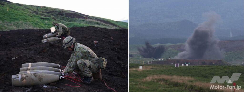 203mm砲弾を転用したIEDとその起爆の様子。IEDはアフガニスタンやイラクの戦争においてテロリストがアメリカ軍を相手に使用したことで知られている。もともとが大口径火砲だけに、爆発の規模もかなりのものだった(写真左/富士教導団X、写真右/筆者)