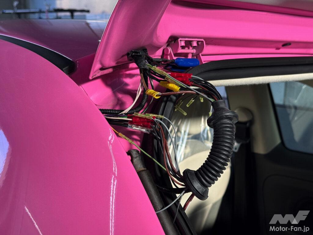 「また、今回の山崎さんのフィアット500のように、リヤハッチのハーネスが断線したり、被覆が裂けて導線が剥き出しとなったりして、ナンバー灯が付かなくなるトラブルも比較的多いです」