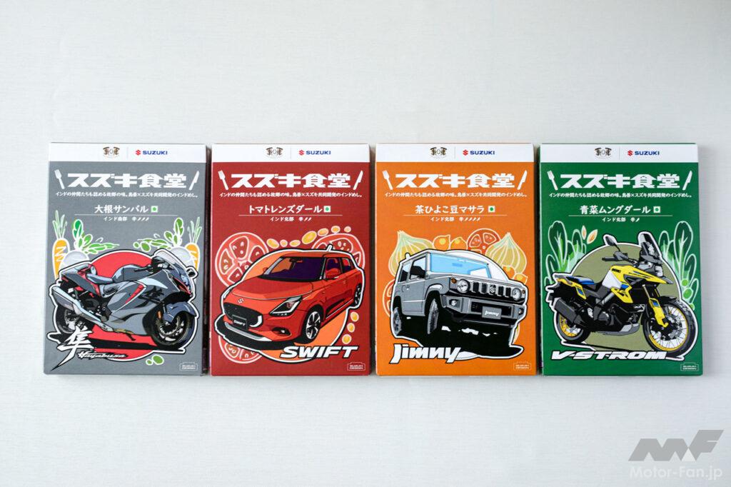 パッケージデザインはスズキの四輪デザイン部が作成。四輪車や二輪車のイラスト周りには各カレーで使用している食材が描かれ、4種類の左側側面を重ねるとひとつの絵になる隠し絵など、食べ終わった後もパッケージを飾りたくなるデザインとなっている。なお、パッケージは他のデザイン展開も検討されているとのこと。