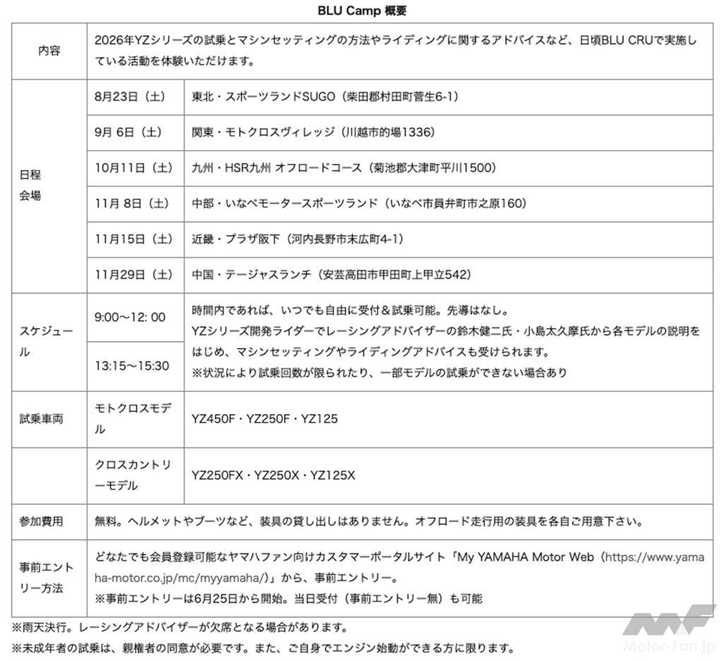 ヤマハ発動機では、2016年よりヤマハ「YZシリーズ」のアマチュアオーナーのためのレース参戦サポートプログラム「BLU CRU(ブルークルー)」をスタート。対象レースにおける上位入賞者には賞典を贈呈するほか、レース会場でレーシングサービスの実施、試乗会・ライディングスクール開催など幅広いサポートを行っている。このたび開催される「BLU Camp」も「BLU CRU」活動の一環だ。
