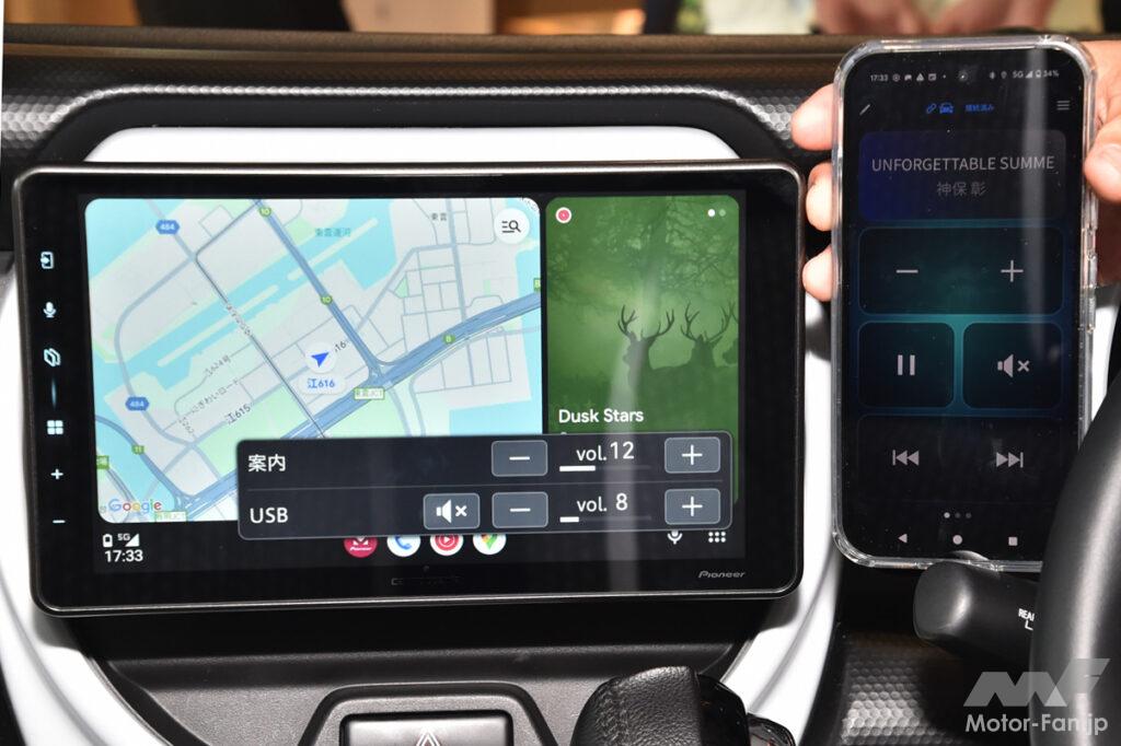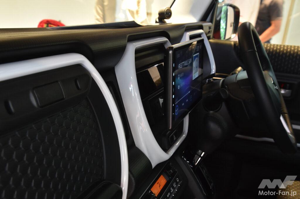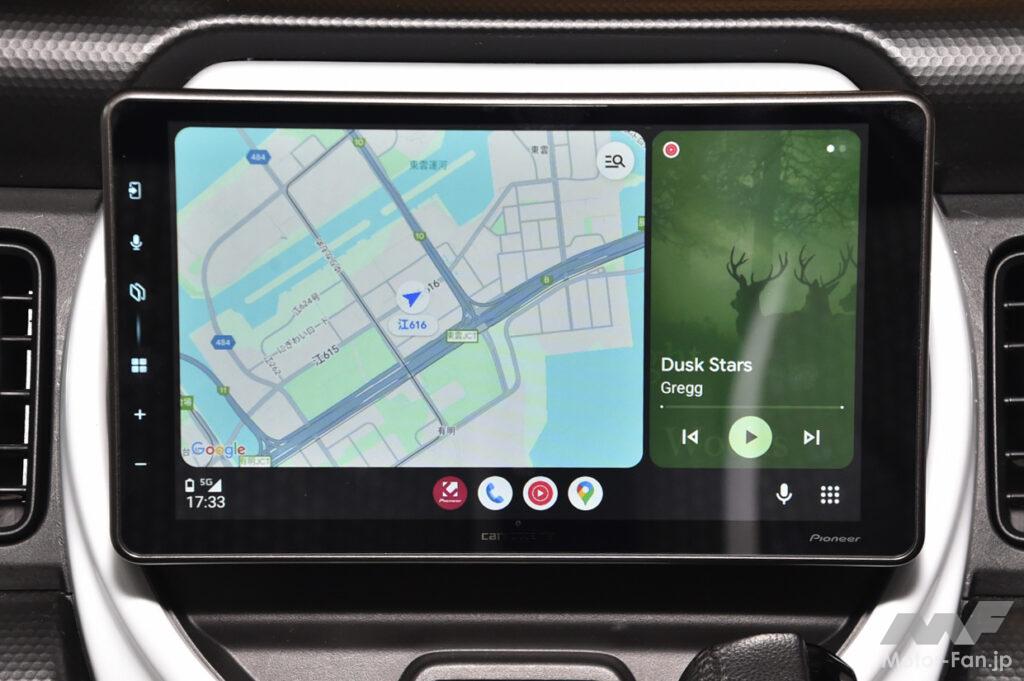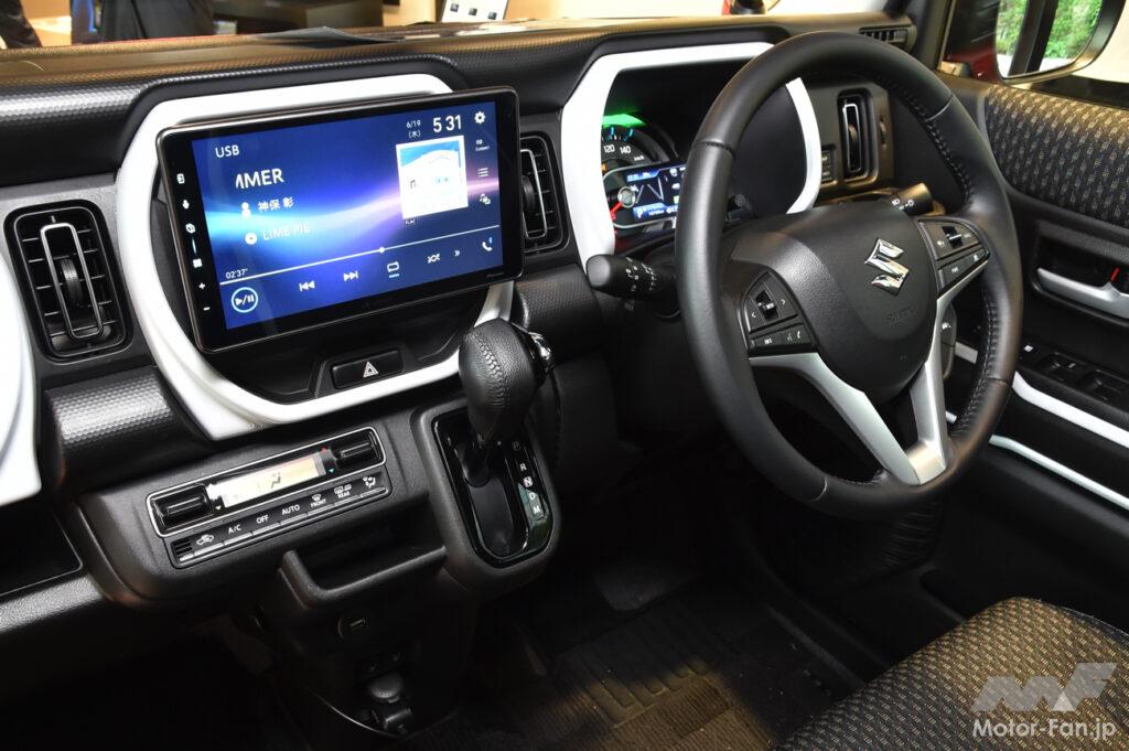 DMH-SF600を装着したデモカーはスズキ・ハスラー。軽自動車だけに9インチでも十分な大画面だ。純正オプションのカーナビもビルトインの9インチだが、同サイズでもDMH-SF600はフローティングタイプなのでより大きく見える。