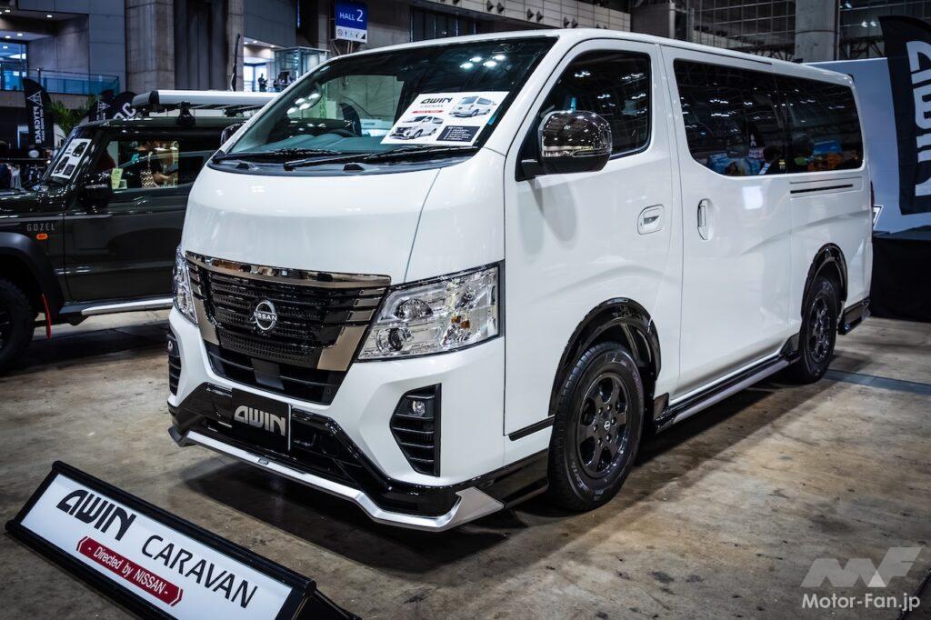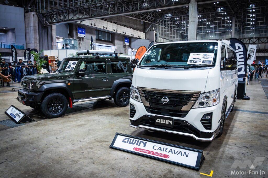 AWIN(エーウィン)ブースでは、GOZELブランドのスズキ・ジムニー シエラとともに、AWINブランドの日産キャラバンが展示されていた。AWINがキャラバン用エアロパーツを手がけるのは、実は2作目。1作目は登場時期が早かったこともあり、現在のAWINのテイストとは異なる路線でデザインされていた。新作では他車種用と同様、デザインモチーフに「Sword Edge(ソード・エッジ)」を採用することで、AWINブランドに相応しいルックスを手に入れている。
