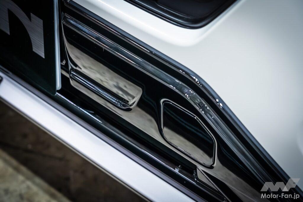 リヤバンパースポイラーは、フロントスポイラーよりもシンプルかつクリーンな造形とすることで、フルコンプリートで装着した際のバランスを高めている。しかし、よく見るとただの平面ではなく、計算された水平ラインが盛り込まれるなど、単調に感じさせない造形となっていることがわかる。