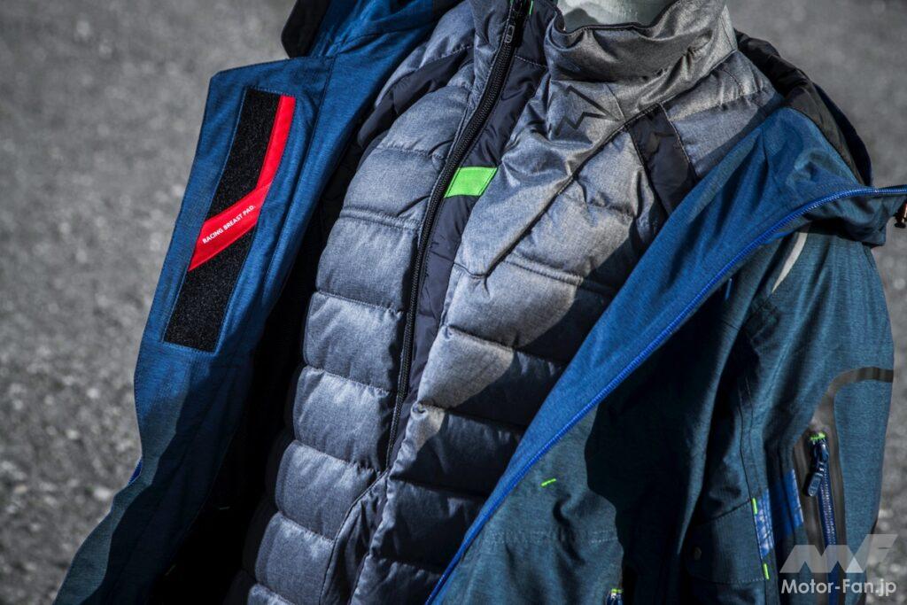 定価56,650円(税込)という価格に見合う、プロテクター標準装備はもちろんのこと、脱着式防寒インナーを装着することで真冬の冷気をシャットアウトする。本体を保温インナーなしの状態でも着用できる防水仕様としており、秋口から冬、春先にかけての三季にわたるツーリングシーズンを快適にサポートする。