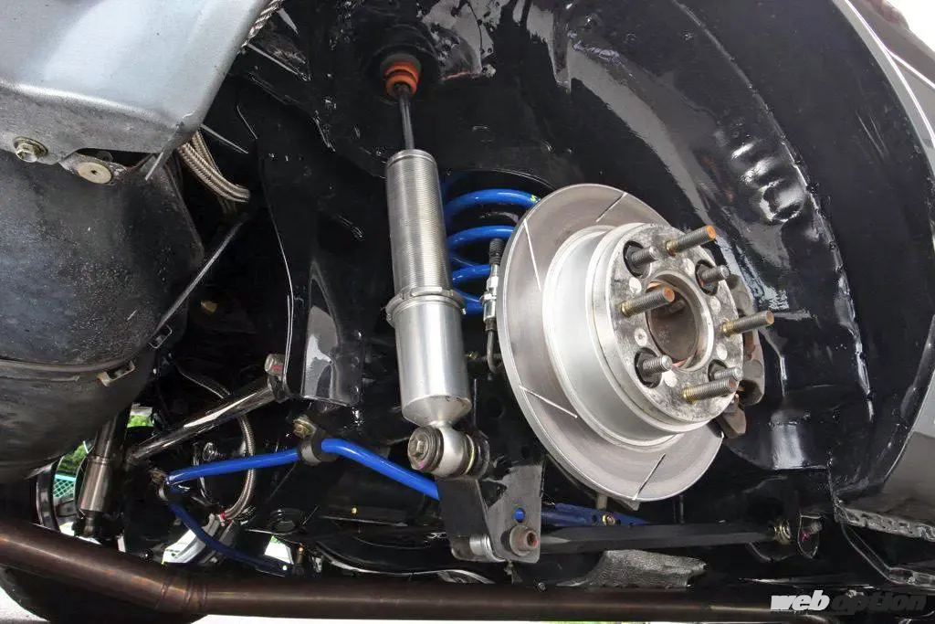 サスペンションのアッパーマウント取り付け部には、室内からバルクヘッドを貫通して伸びるロールバーが溶接留めされている。レース車両製作の技術をフィードバックし、ハチロクの特性にベストマッチするボディ剛性を実現するためのレイアウトだ。