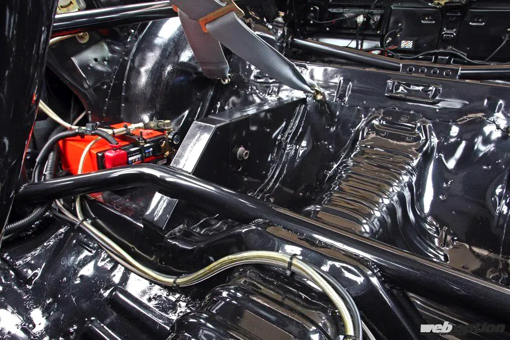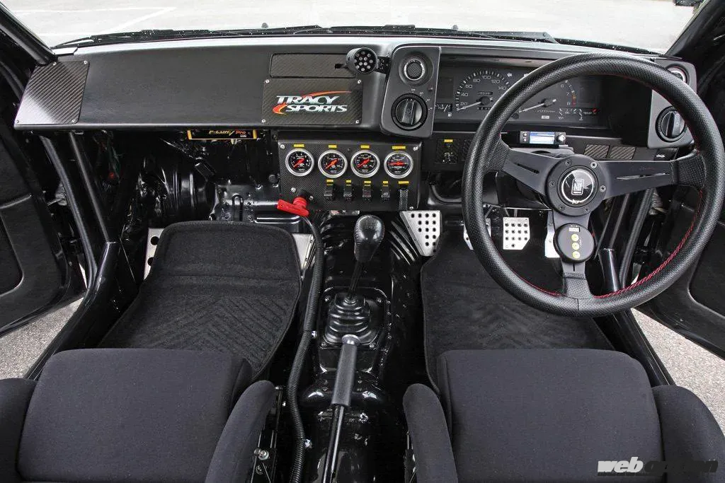 エンジン以外にも注目ポイントは多数だ。例えばボディ補強は、レーシングカー製作も行うトレーシースポーツのノウハウがふんだんに投入され、エンジンスペックやタイヤとのバランスを考えながら施工。ホワイトボディ状態からフルスポット増しを行い、同時にワンオフロールケージが組み込まれている。