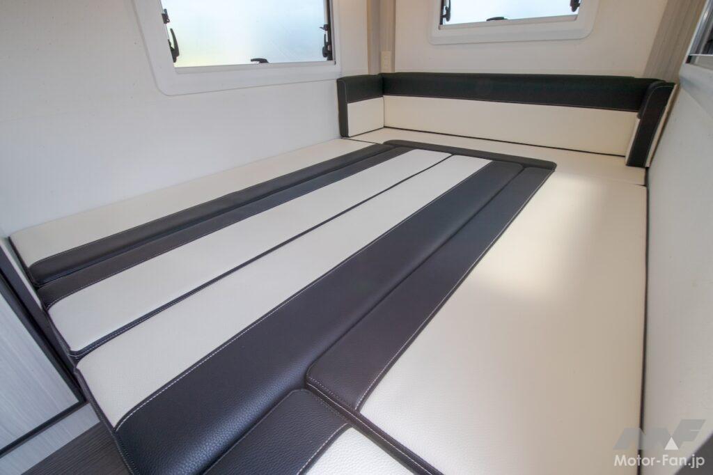 ソファはマットを並べることでベッドに変身。その広さは1800×1420mmとほぼダブルベッドサイズとなる。ちなみに、ポップアップルーフ内にマットを展開した場合、1860×970mmの就寝スペースを確保することができる。