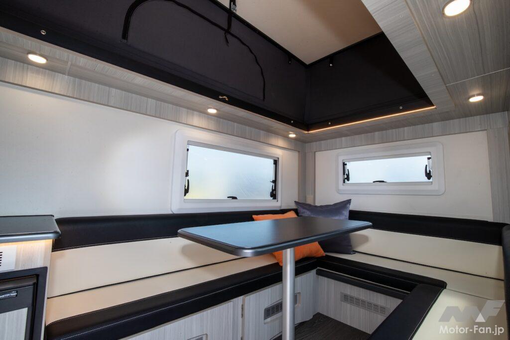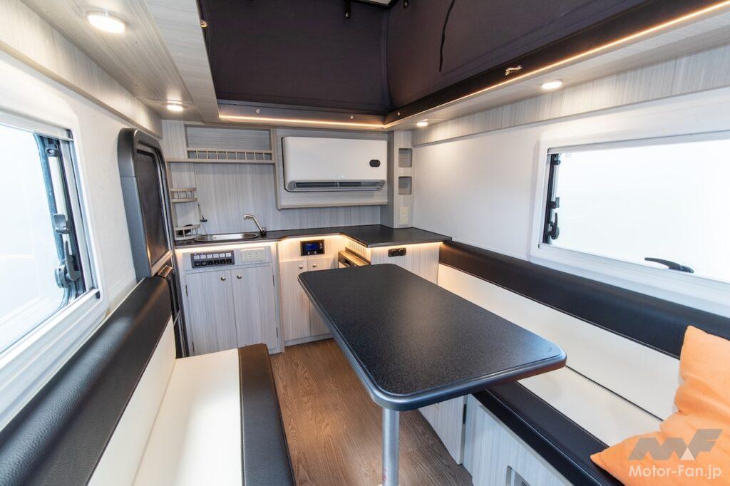 車内に入るとその雰囲気は、同社製キャンピングカーそのもの。シンプルで洗練されたテクスチャーは、一朝一夕では培えないセンスにあふれている。こんなにコンパクトなのに、冷蔵庫をインストールしたシンクは広くて実用的。もちろん、ダイネットもゆったりとしており、大人4名がくつろぐことができる。