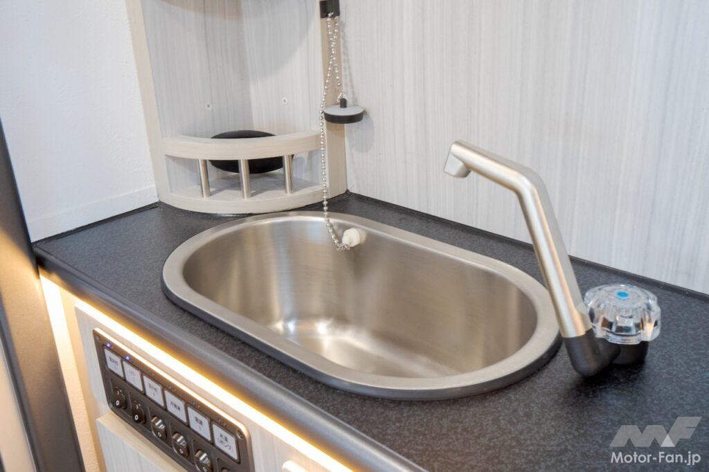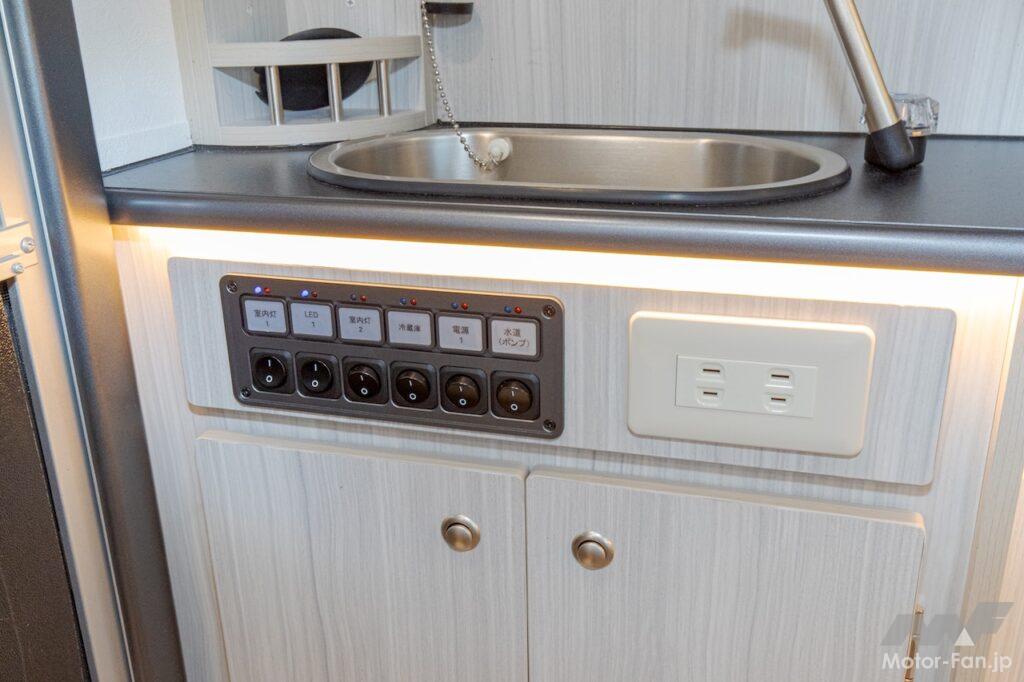 ちなみに標準装備としては、ベッド、テーブル、105Ahサブバッテリー1個、冷蔵庫、シンク、インバーター、バックカメラ、ポータブルトイレとなっている。オプションでエアコン、201Ahリチウムイオンバッテリー、ソーラー充電パネルを設定。フルオプション搭載でも、車重は600kgを切るというから、排気量の小さなヘッド車でも安心だ。