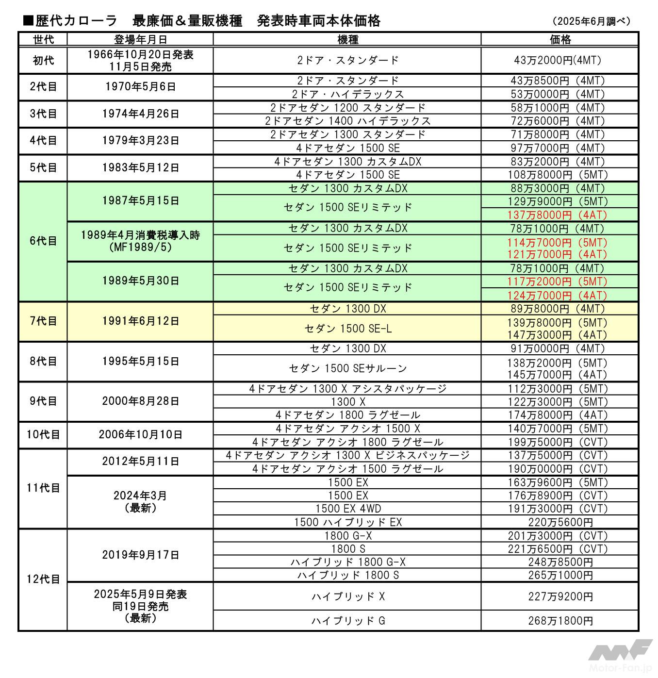この表では主に各車の最廉価モデルの価格を入れたが、暮らしが豊かになるにつれ、カローラもアルトも装備充実機種が売れ筋になってくるから、ある代は量販機種の価格も入れてある。