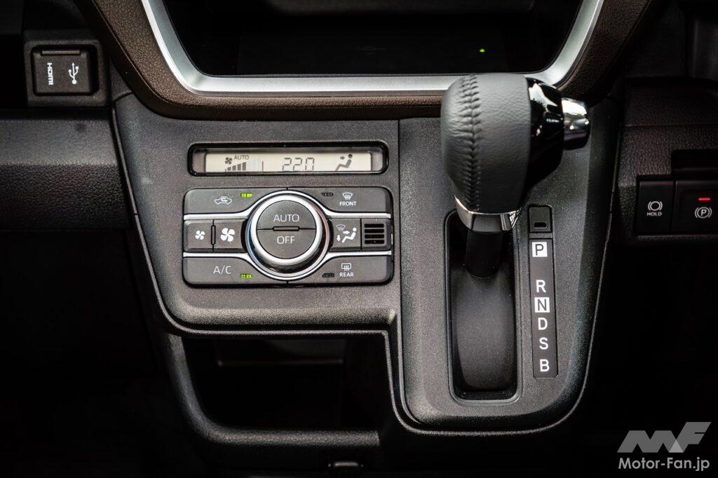 インテリアはスリーク(つややか、スマート)さと実用性の両立を図ってデザインしたそう。センターコンソールを中心に左右対称なウイング形状とする構成は先代と共通。先代ムーヴは2段構成の重ね合わせ部にエアコンの吹き出し口を隠すように配置していたが、新型は幾何学的な造形のエアコン吹き出し口を目立つように配置している。上位グレードは吹き出し口や、一体的にデザインされたカップホルダーにシルバーの加飾が付く。