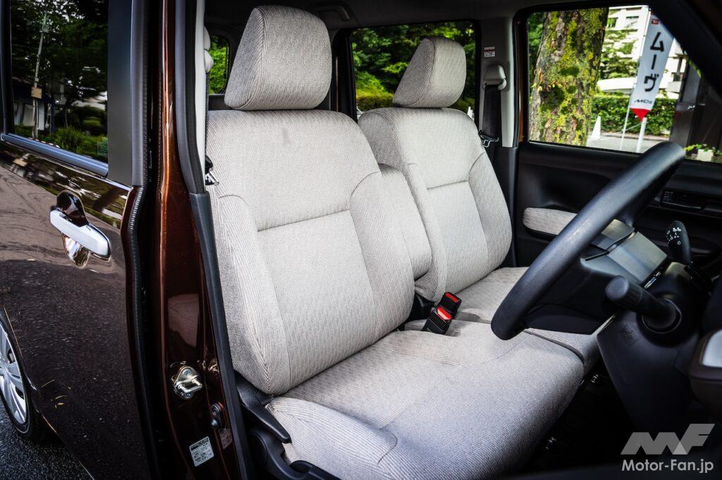 カラーやマテリアルに関しても上質さ、仕立ての良さを意識。G、RSのシートはネイビー色ということになっているが、実はブラウンの糸を織り込んでおり、インパネのブラウン色とのコーディネートを図っている。こだわりはセンターアームレストだ。従来は側面に異なる素材を使っていたそうだが、新型ムーヴではシートと同じ素材をおごった。チラッと目に入ったときの印象が違うそうで、気が利いた仕掛けである。