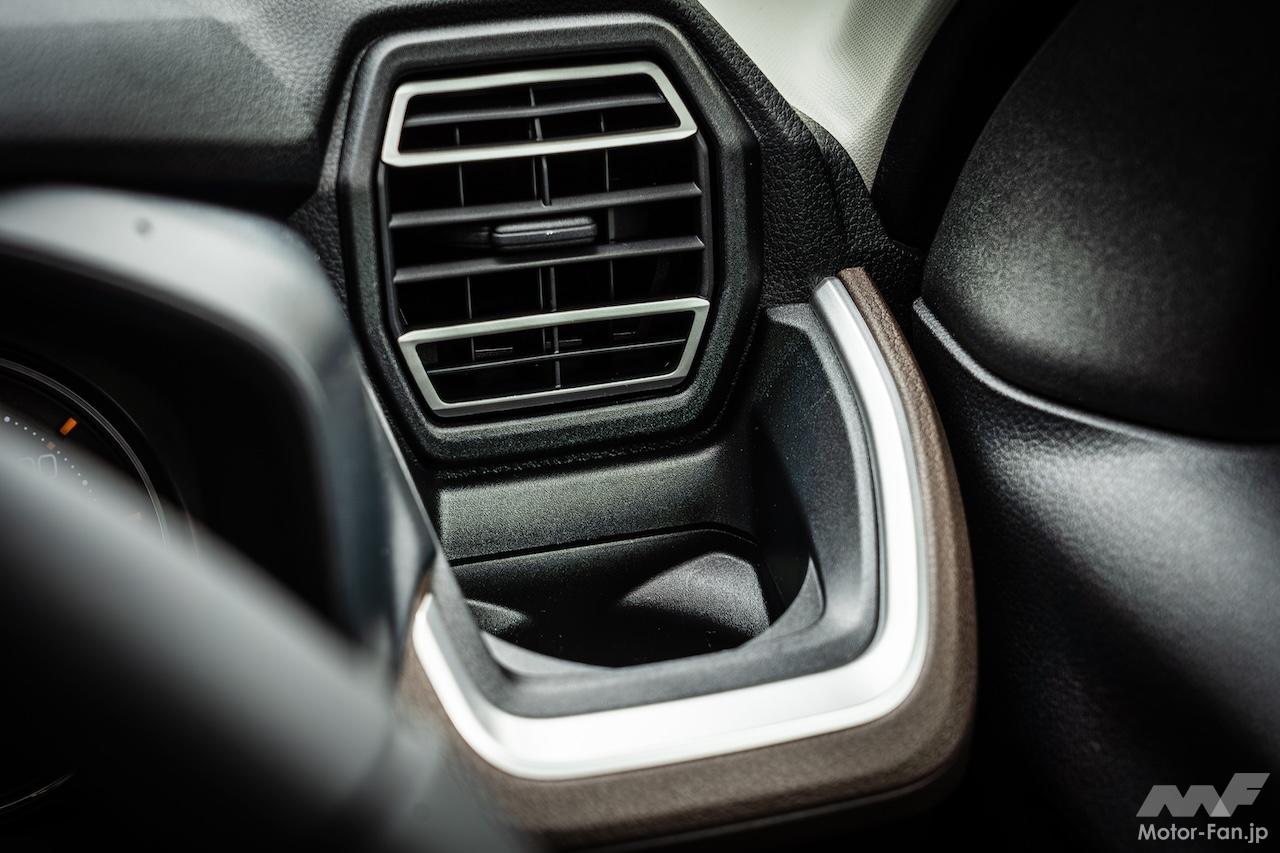 「車両感覚をつかむためにも水平の軸は大事」とデザイナー氏。サブウインドウ越しに外が見えることもあり、視界は良好。六角形の空調吹き出し口に向かうインパネの隆起が秀逸で、昔アニメで見たロボットや宇宙空間を移動するファイターのコックピットを想起させる。このあたり、新人類世代に響くのではないだろうか。