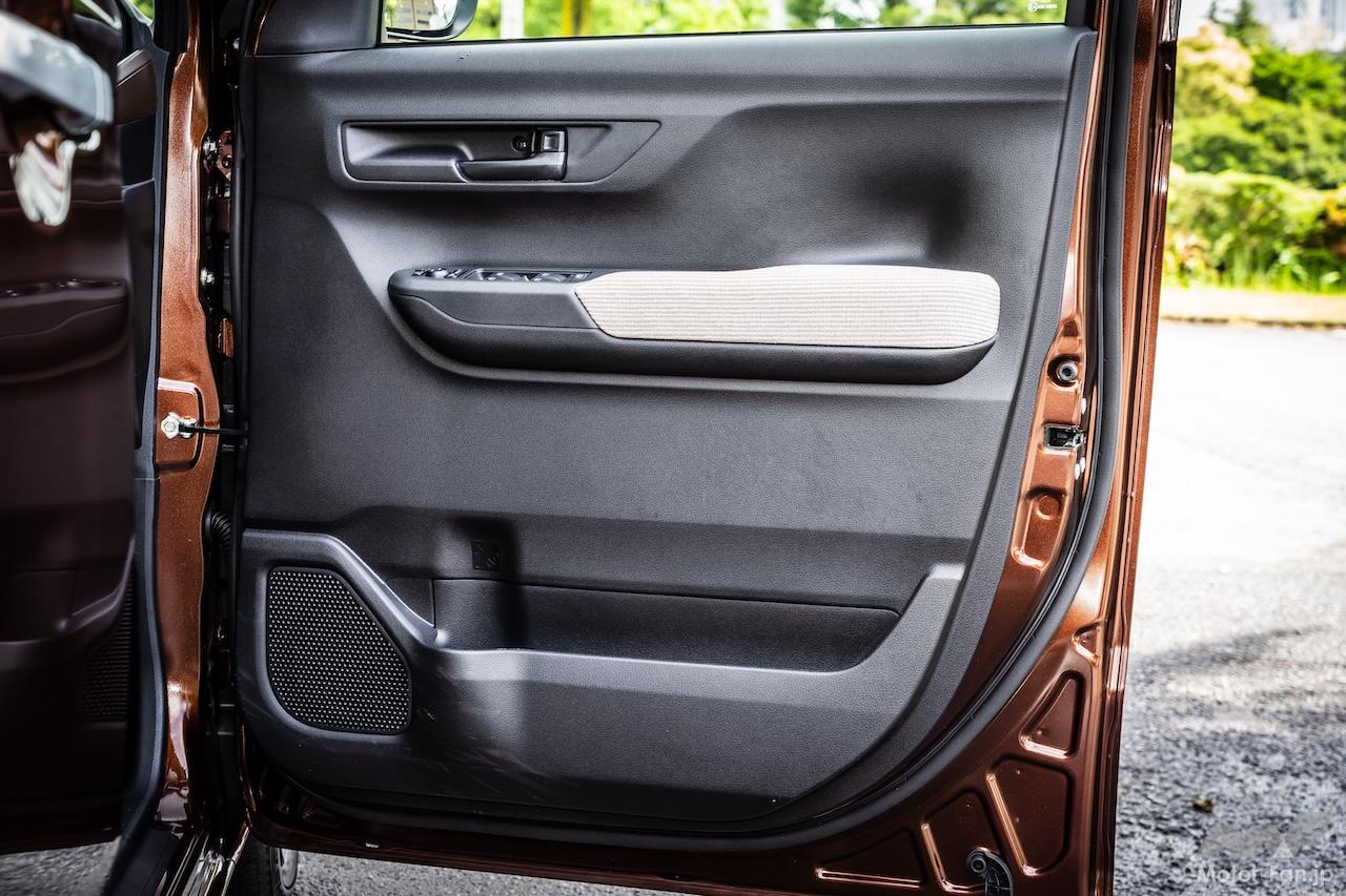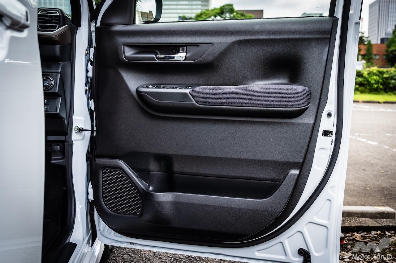 エクステリアは動きの美しさにこだわったという。スライドドアを採用すると、どうしても全高は高くなってしまう。新型ムーヴの全高は1655mm(2WD)で、先代より25mm高い。すっきりとした動きを表現するため、スライドドアの後ろでキャラクターラインをキックアップさせて垂直尾翼風にしている。さらに、ドアがベタッとしないようドアハンドルの上に濃い目のプレスラインを入れ、下部は台形のプレスラインを組み込むことで鈍重さを払拭した。