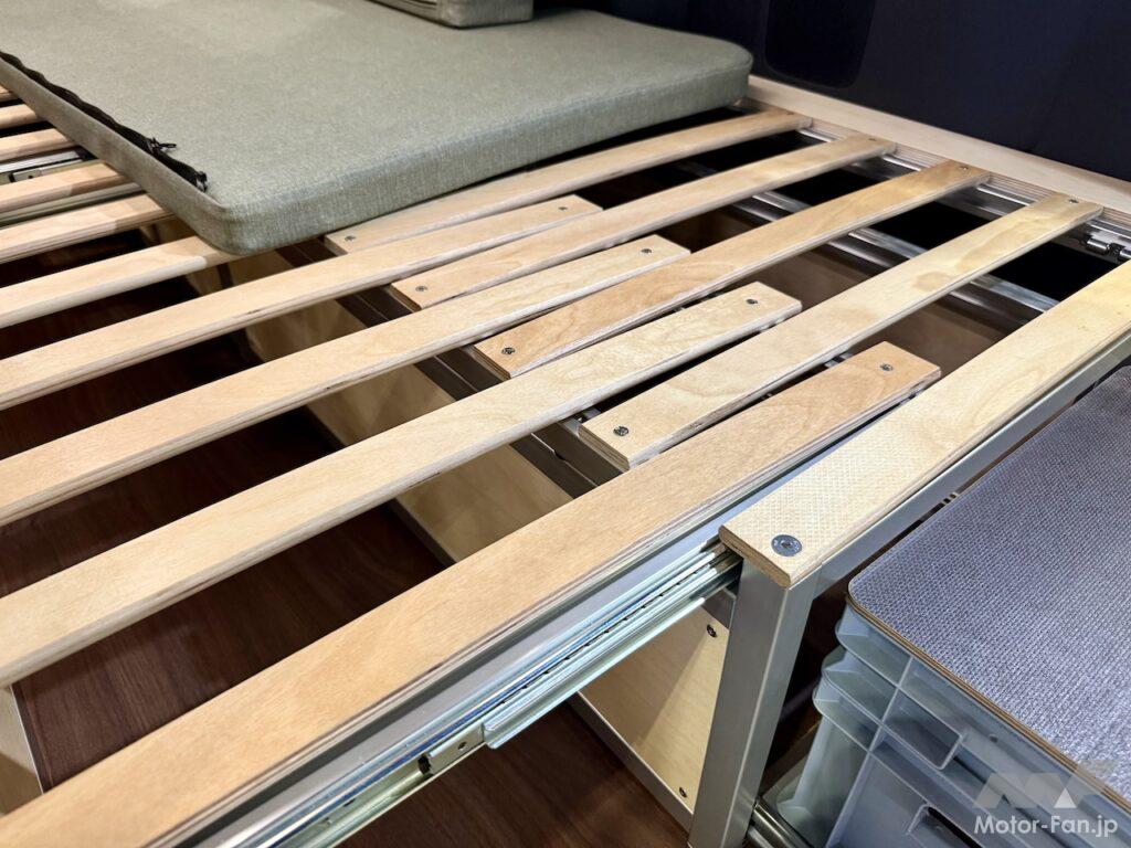 ベッドも、一般的なキャンピングカーとはひと味違う。ベースに、家庭用ベッドのようなウッドスプリングを使っているので寝心地抜群。通気性にも優れているので、四季を通じて快適な就寝が約束されるのだ。