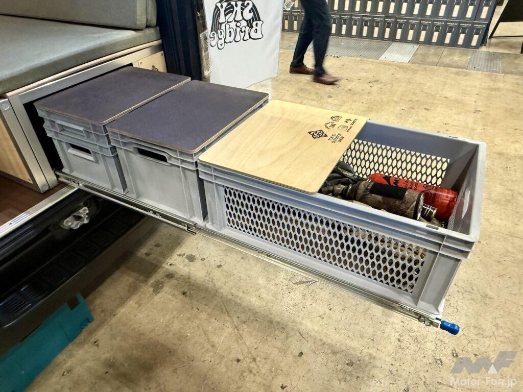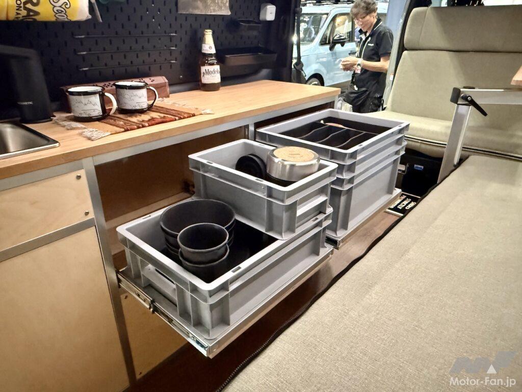 グリッドの家具の特徴・その2は、引き出しの中にドイツ製コンテナ「アルテック」を使っていること。一般的に、キャンピングカーの収納は引き出しだったり、キャビネットだったりと“空間”になっている。自由に使える、拡張性がある、という点ではいいのだが、物をシステマティックにまとめるには別途のアイテムが必要になる。