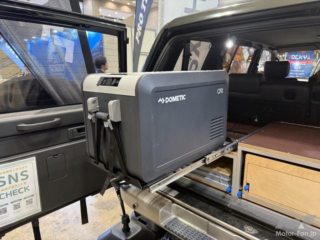まずシステムのベースとなる基台をインストールし、この中にドイツ製のコンテナボックス「アルテック」を引き出しのように入れるというものだ。加えて、その左右にはオプションでサブバッテリー(50Ahリチウムイオンバッテリー×1個)や車外で使うシャワーシステム、外部電源システム(バンパー内)を入れることができる(ジムニーなど室内幅が限られる車種はどちらかひとつの搭載が可能)。
