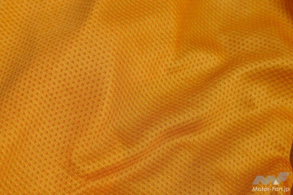 冷感ポンチョの特殊冷感生地は非常に薄く、肌触りも良好。ゴワゴワ、ザラザラ、チクチクした類いの着心地の悪さはまったくない。また水をたっぷり吸わせた状態でも、革ジャンなどヘビーな衣服を着たような重苦しさは一切なく、薄い上着を一枚重ね着した程度の、軽量で軽快な印象だ。