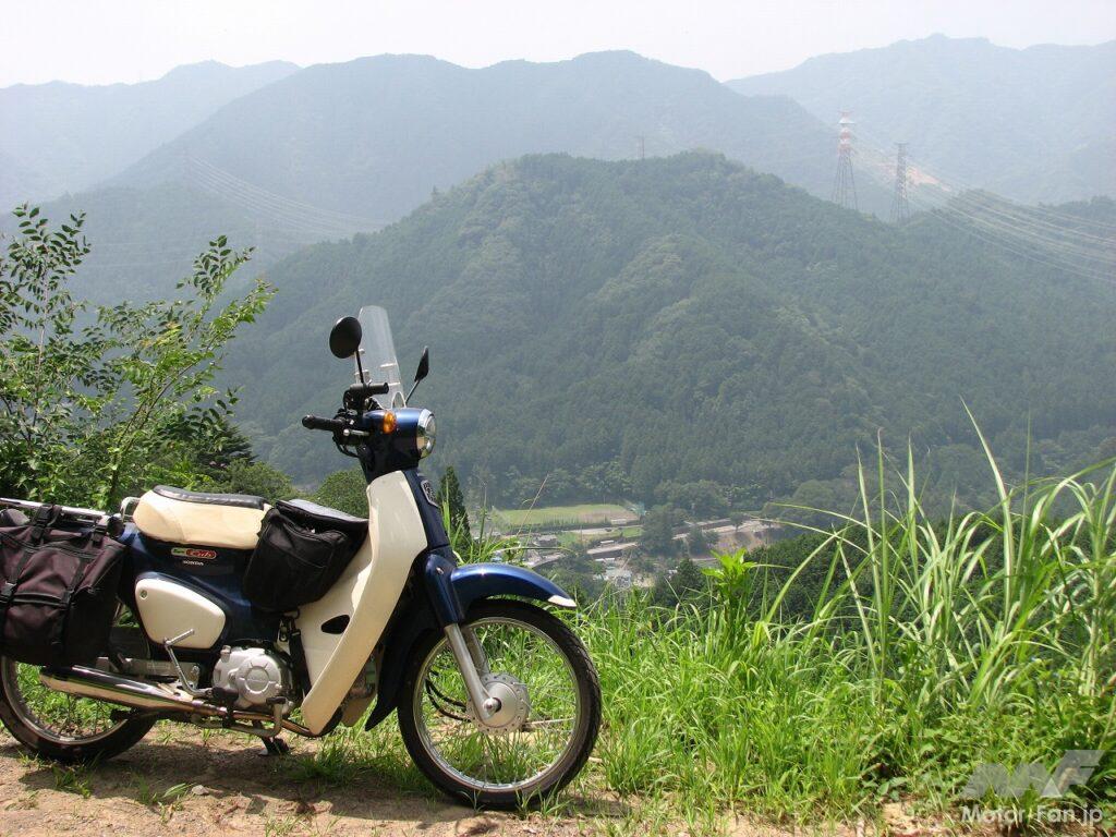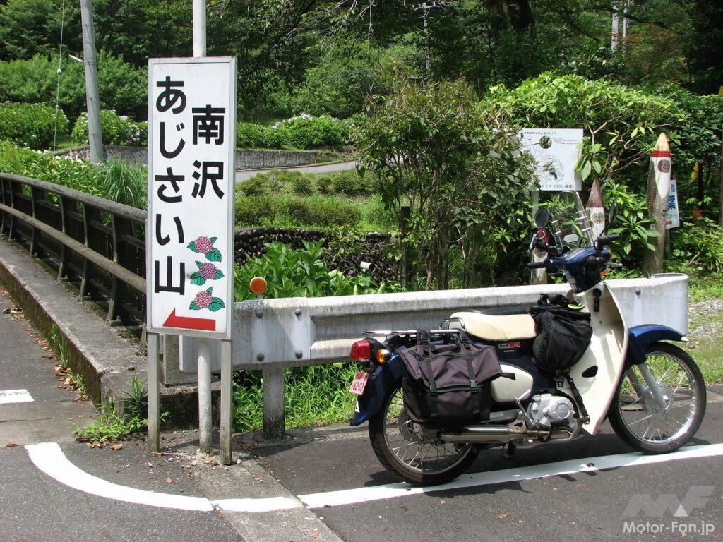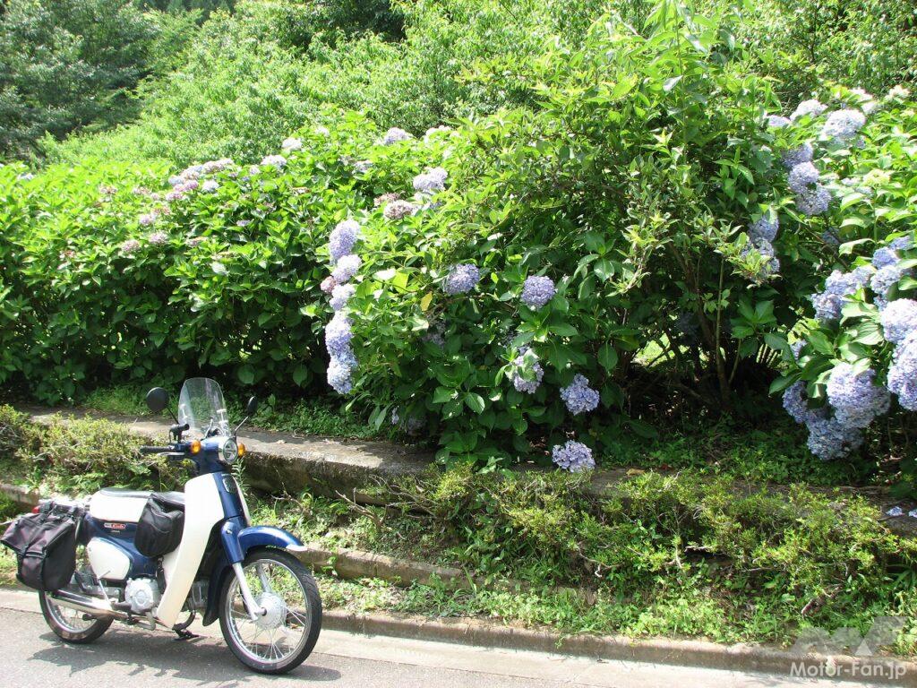 武蔵五日市駅の裏手に回り、深沢地区へ向かう狭い市道を走ります。山間へと進むに従い、緑が深いせいかわずかに暑さが緩和されてきました。深沢の集落に入る手前に「南沢あじさい山」の案内看板が出ていました。案内に従って林道南沢線へとカブを導きます。少し行くと左手に南沢あじさい山があります。地元の忠一さんという方がひとりで50年をかけて1万本のアジサイを植えた場所で、五日市の観光名所になっています。すでにアジサイの見ごろは過ぎてしまっていましたが、林道沿いに数種類のアジサイの花を見ることができました。
