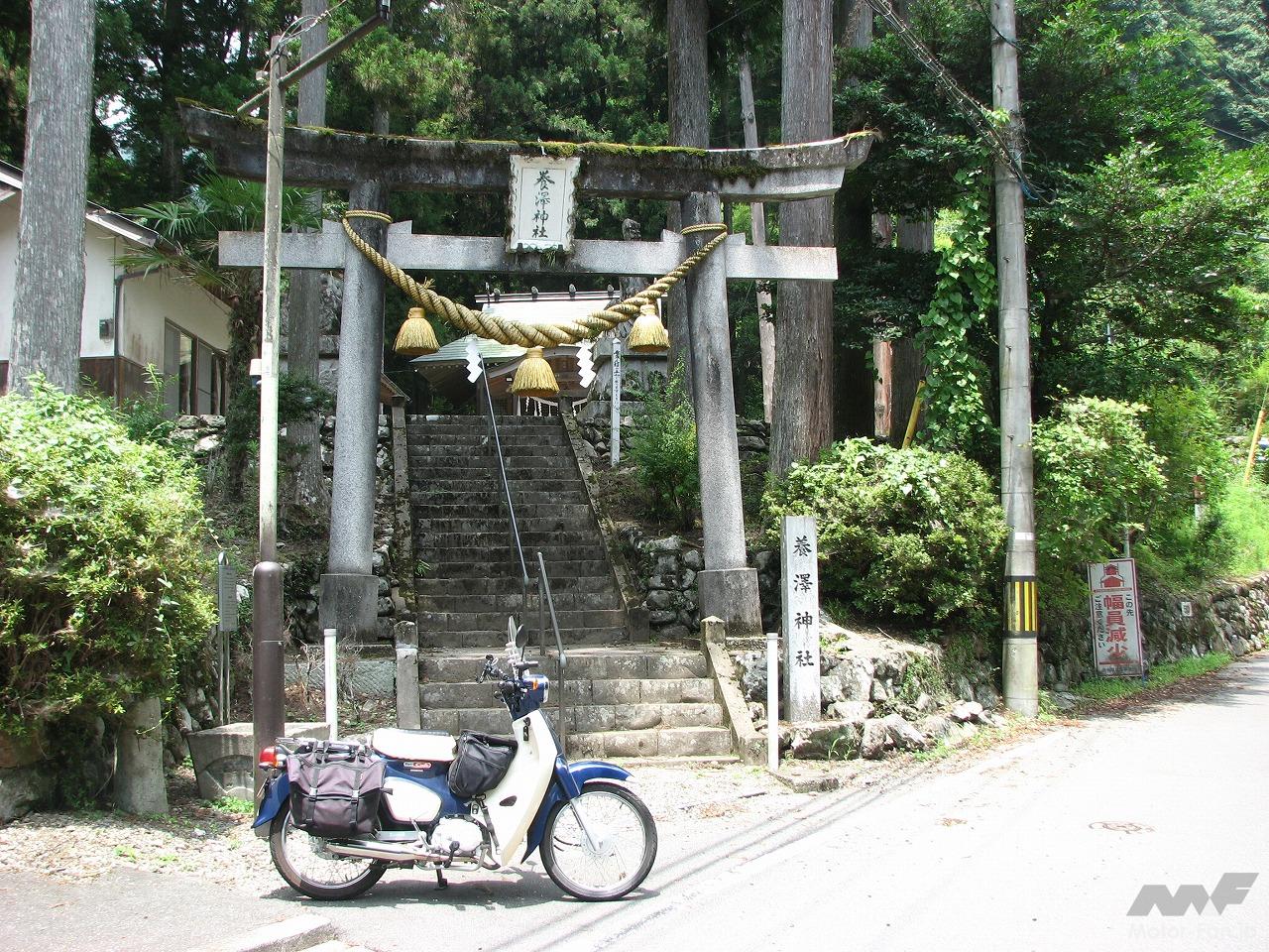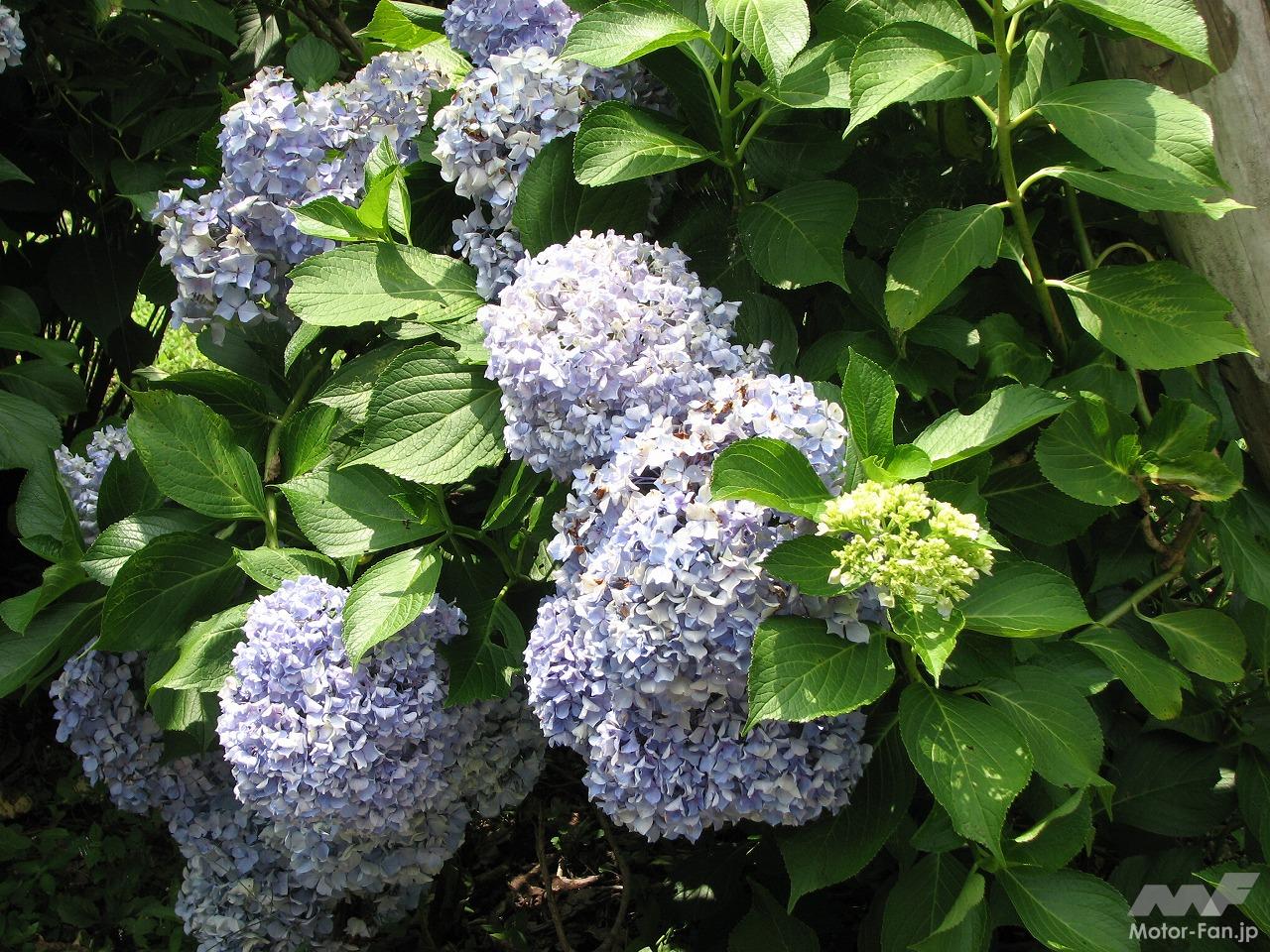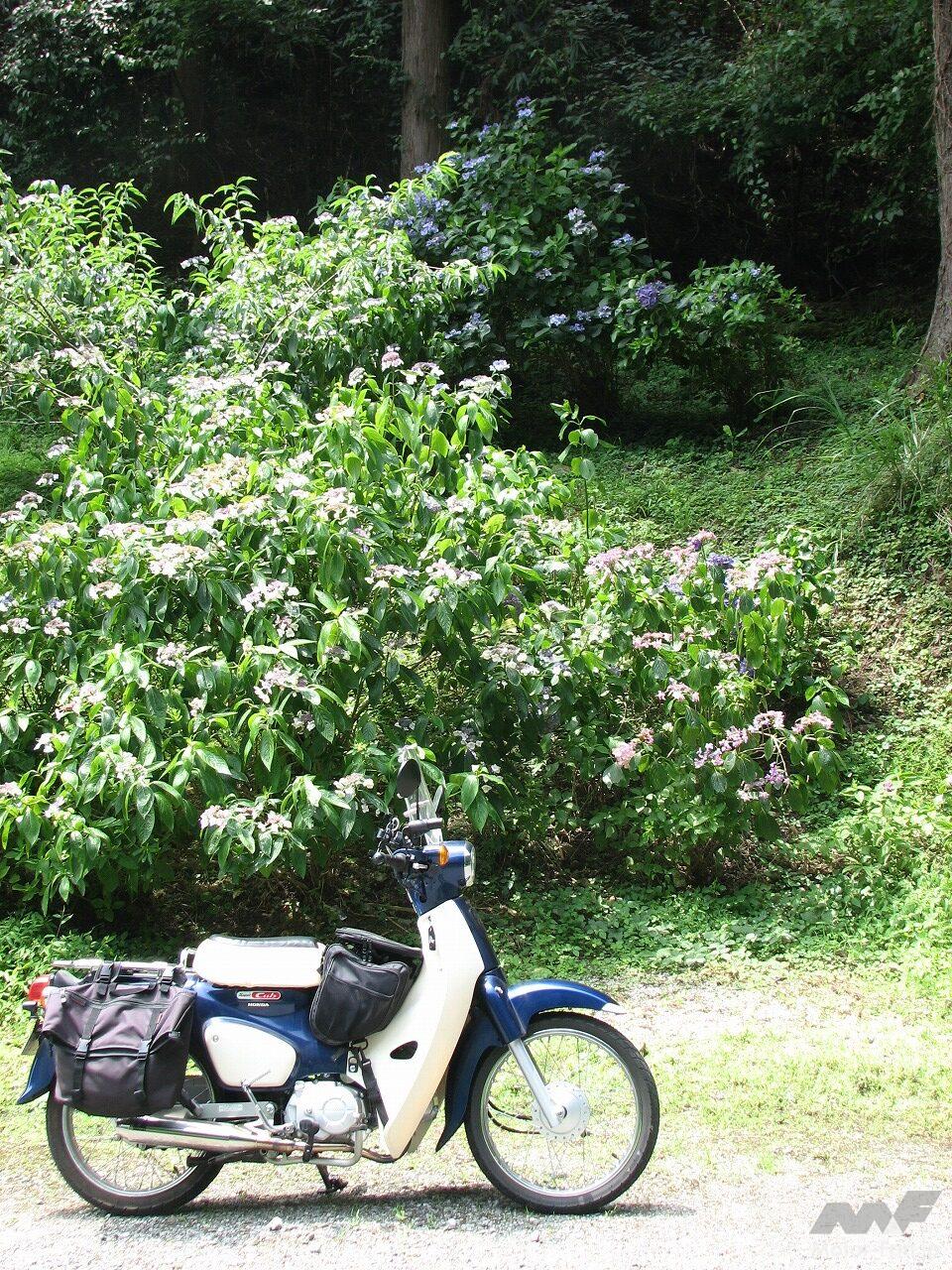 武蔵五日市駅の裏手に回り、深沢地区へ向かう狭い市道を走ります。山間へと進むに従い、緑が深いせいかわずかに暑さが緩和されてきました。深沢の集落に入る手前に「南沢あじさい山」の案内看板が出ていました。案内に従って林道南沢線へとカブを導きます。少し行くと左手に南沢あじさい山があります。地元の忠一さんという方がひとりで50年をかけて1万本のアジサイを植えた場所で、五日市の観光名所になっています。すでにアジサイの見ごろは過ぎてしまっていましたが、林道沿いに数種類のアジサイの花を見ることができました。