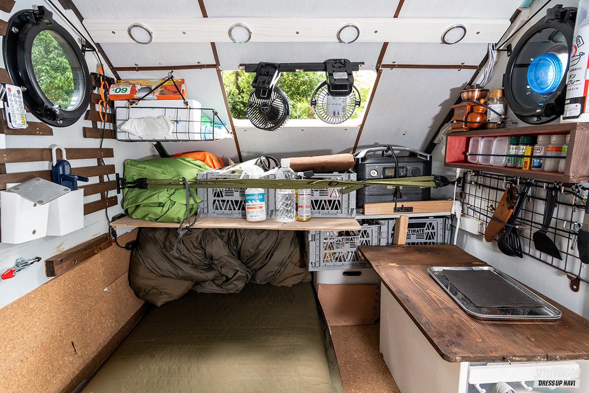 ちなみにハイゼットに搭載されているシェルは2号機だそうで、初号機はYouTubeに感化されて製作したというバイクで牽引するリヤカー小屋。今回の撮影でお邪魔した青柳さんが根城にする裏庭キャンプ場に常駐させているリヤカーは、親子のようなサイズ感でありながら同一コンセプトで製作された秀逸なプロダクトであることが感じ取れるのだ。