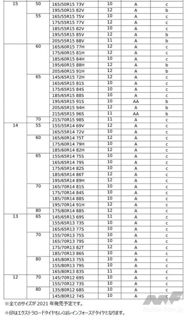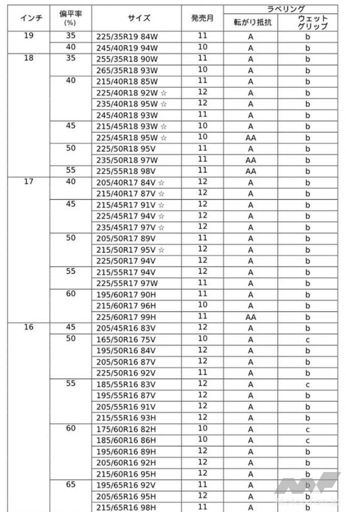 トレッドパターンは「ライトニンググルーブ」や「5ピッチトレッドパターン」などを採用し、優れたウエット性能や耐偏摩耗性能を発揮。見た目にもこだわり、力強さと美しさを併せ持つデザインを実現している。コンパウンドは従来品にも採用した「ナノブレンドゴム」を採用し、優れた低燃費性能に加えて、ウエット性能と耐摩耗性能をバランスよく両立させた。また、最適化した接地形状もウエット性能、耐偏摩耗性能に寄与している。