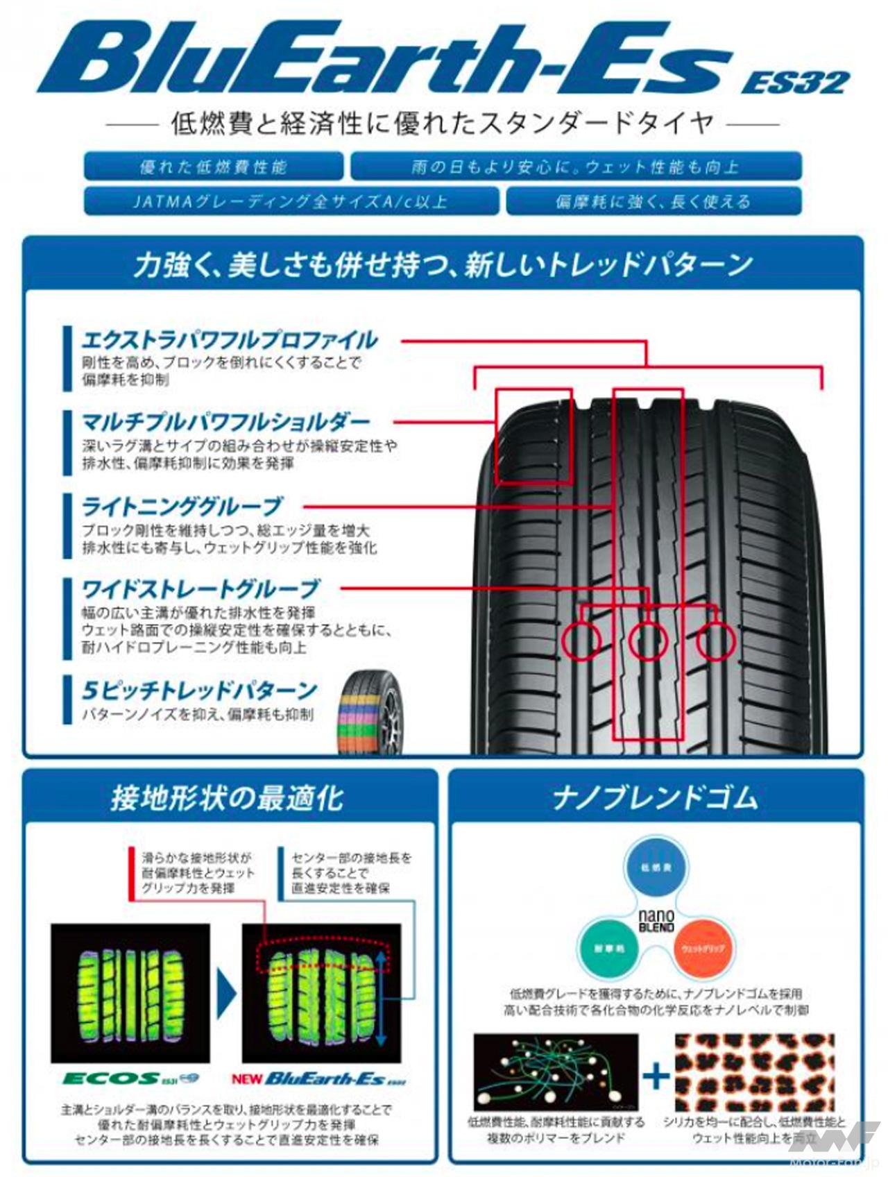 「BluEarth-Es ES32」は従来品「ECOS ES31」の後継モデルとして8年ぶりに発売するYOKOHAMAスタンダードタイヤの新商品。従来品で定評のあった基本性能はそのままに、優れた低燃費性能やウエット性能を発揮する。また、偏摩耗を抑制しロングライフを実現している。国内タイヤラベリング制度では全92サイズで転がり抵抗性能「A」、ウエットグリップ性能「c」以上を獲得し、一部サイズでは転がり抵抗性能「AA」、また多くのサイズでウエットグリップ性能「b」を獲得している(下記サイズ表を参照)。