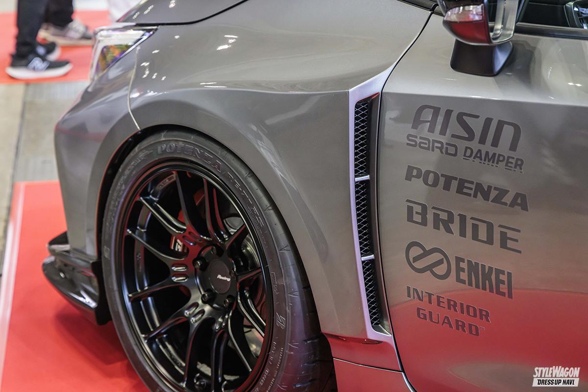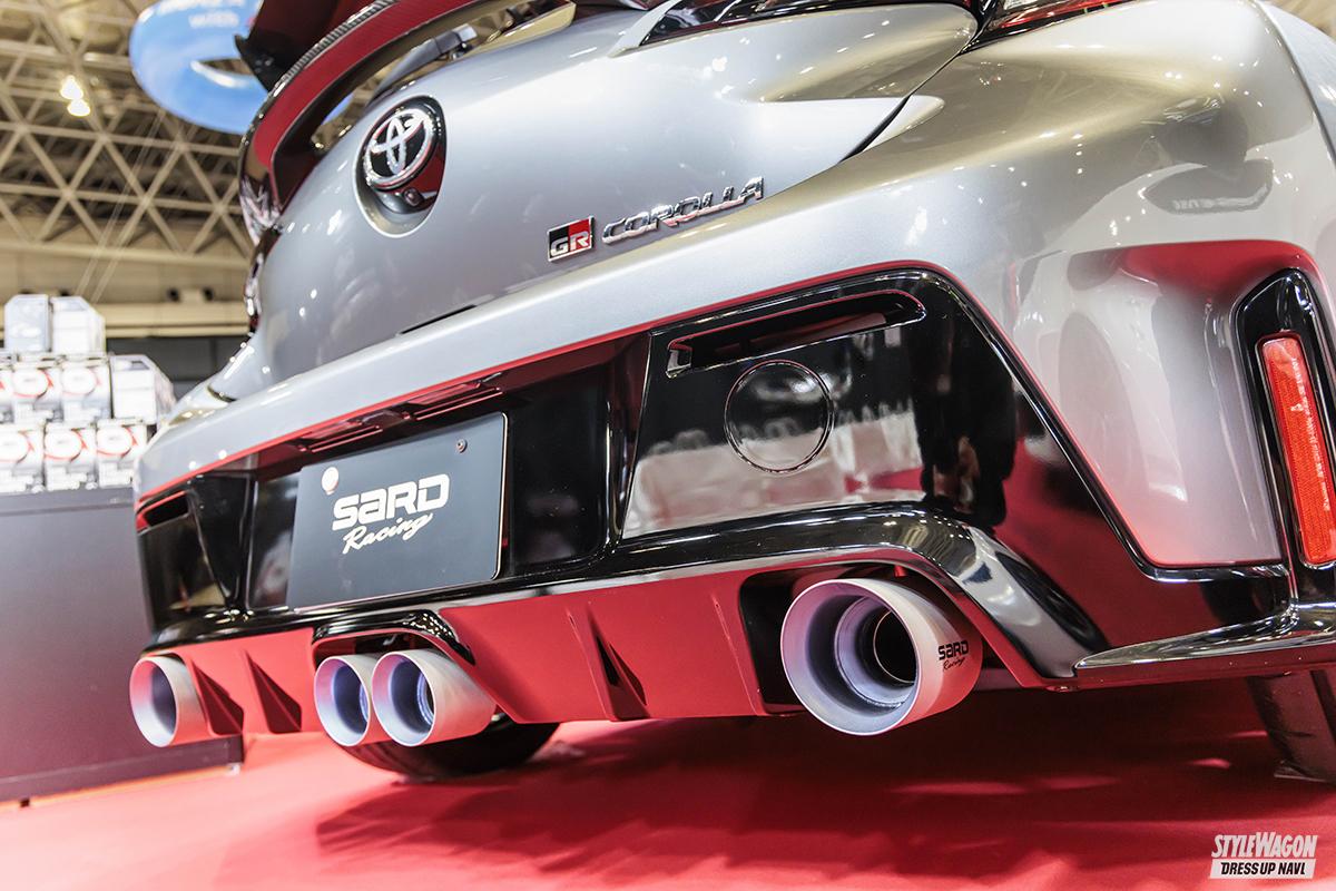 サードパフォーマンスエアロと名付けられたこのキットは、FRP素材だけでなくカーボン製も選択が可能で、空気の流れを予感させる3Dフォルムとなるからカッコいい。2段式ディフューザー風となるフロントコーナーや、ガッツリとワイドなフェンダーダクト、力強いリアなどそのどれもがいかにも速そうな造形で、これはもはやカローラではなく戦うためのGTマシンといった雰囲気を堪能できる。