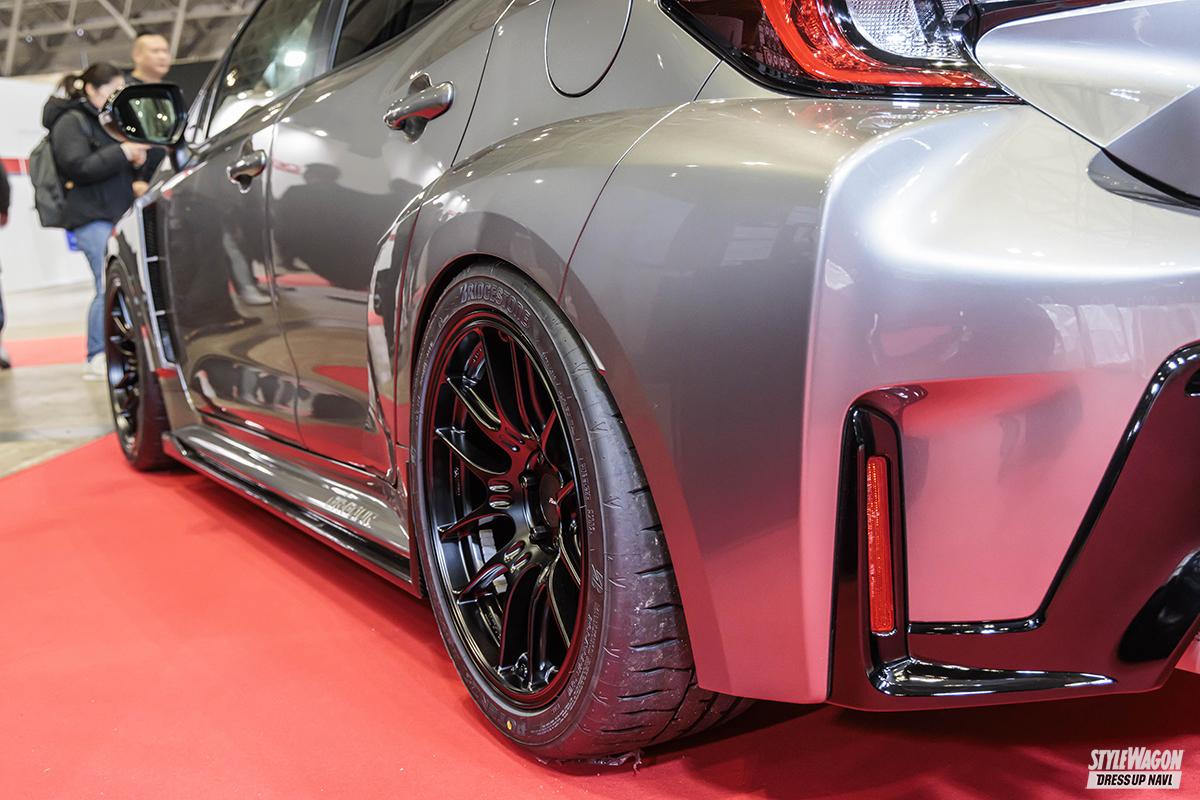 東京オートサロン2024で初披露となったサードのGRカローラ用ボディキットは、サードがこれまでにレース活動で得てきたノウハウを余すことなく投入したまさにGTな仕上がり。ワイルドでアグレッシブなその見た目だけでなく、ダウンフォースなどの空力性能にも配慮された、速く走るための機能系エアロとなるのが特徴だ。