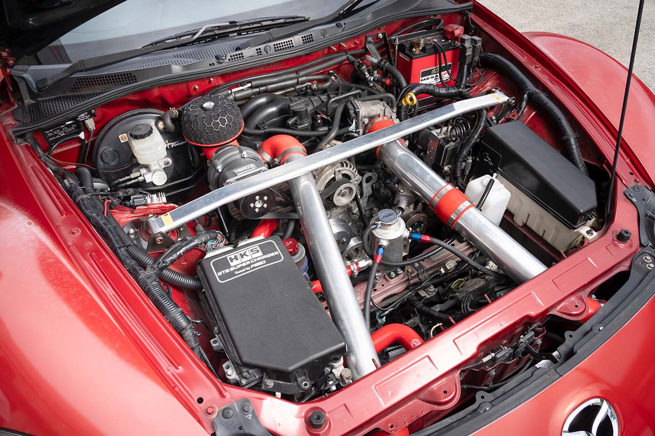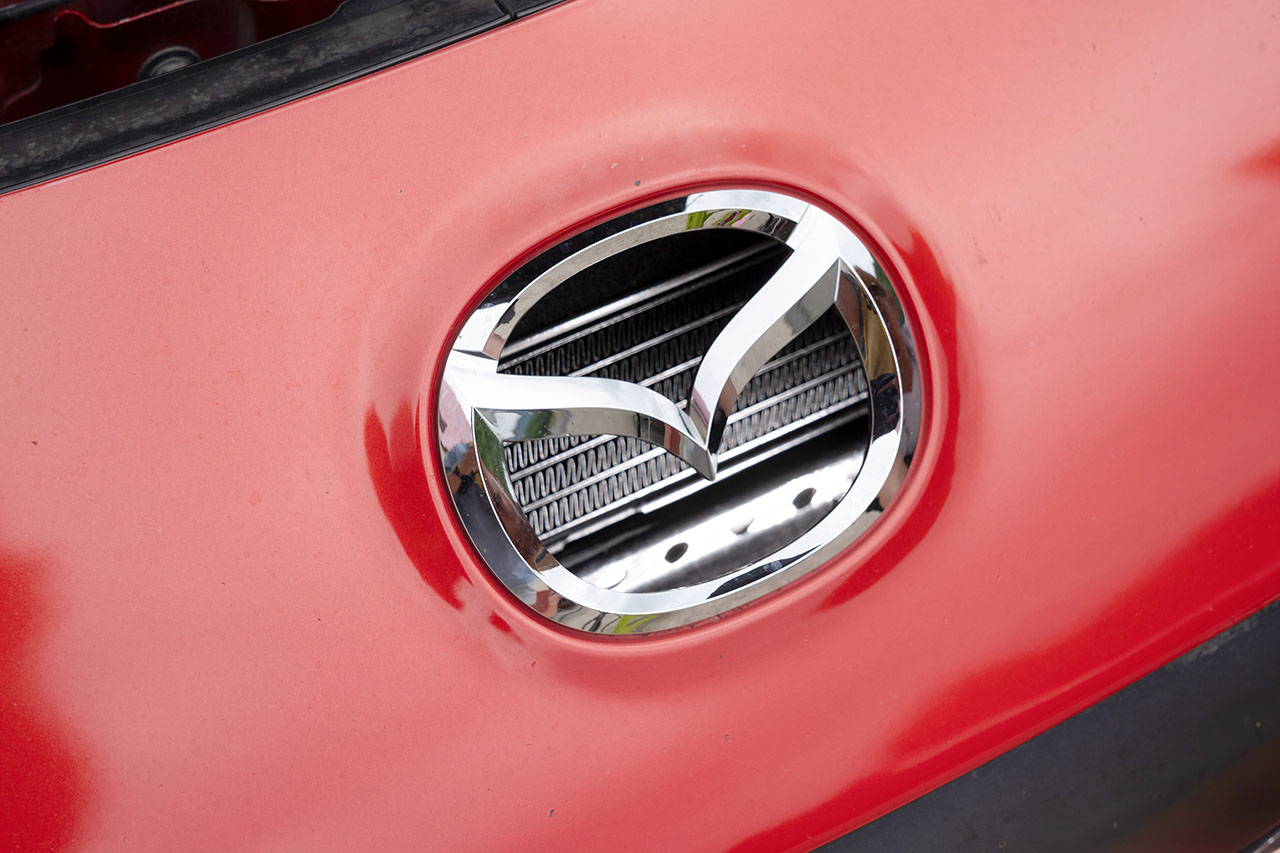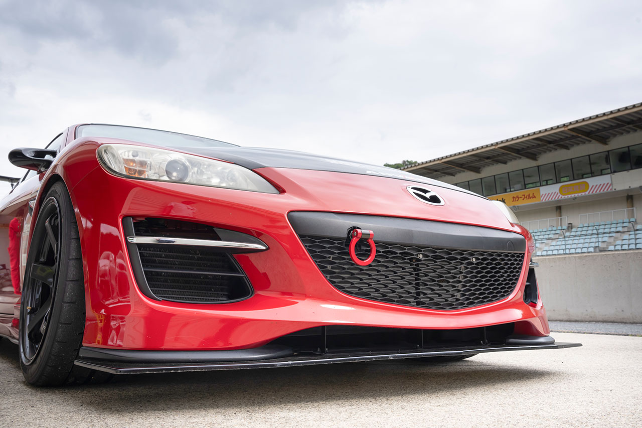 スーパーチャージャーのオイルクーラーは、フロントバンパー内にレイアウト。マツダのエンブレムは大胆にくり抜かれ、そこから走行風をダイレクトにオイルクーラーへと導く仕様だ。