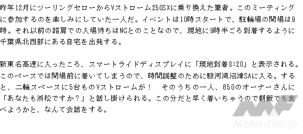 昨年12月にヤマハのツーリングセローからVストローム250SXに乗り換えた筆者。このミーティングに参加するのを楽しみにしていた一人だ。イベントは10時スタートで、駐輪場の開場は9時。それ以前の路肩での入場待ちはNGとのことなので、現地に9時半ごろ到着するように千葉県北西部にある自宅を出発する。
