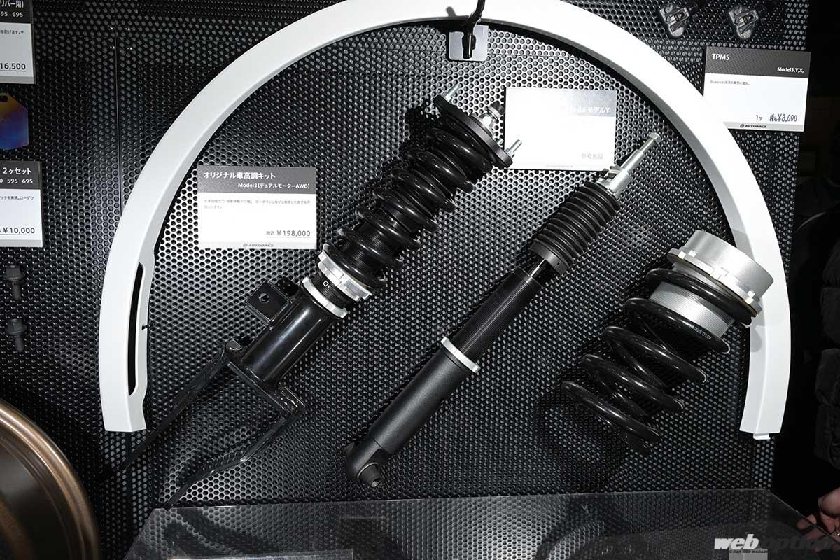 A PITオートバックスでは昨年の出展時からオリジナルの車高調をセットしていたものの、新たにEV車チューニングブランド「A PIT EVパフォーマンス」を立ち上げバージョン2となる車高調を製作。スプリングレートはフロント18kg/mm&リヤ13kg/mmでバージョン1(フロント10kg/mm&リヤ8kg/mm)よりもスポーティなセッティングとなる。