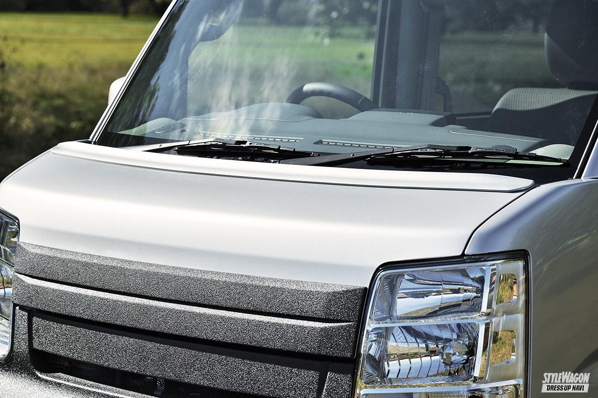 300系ハイゼットカーゴに用意されたのは、現行の700系ルックに変貌させるフェイスチェンジ系バンパーキット。ネクサスジャパンとのコラボモデルで、同社のバンパーガードやグリルカバーも装着可能。デモカーのようなチッピング塗装とあわせれば、オフ感満点のスタイルを演出できる。